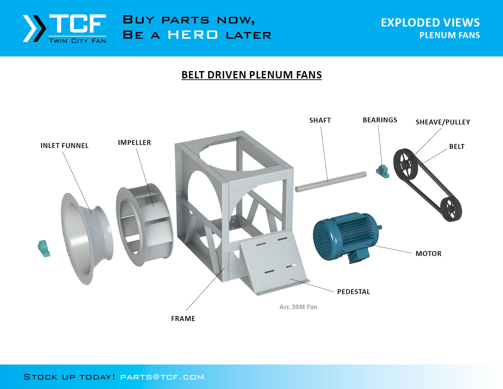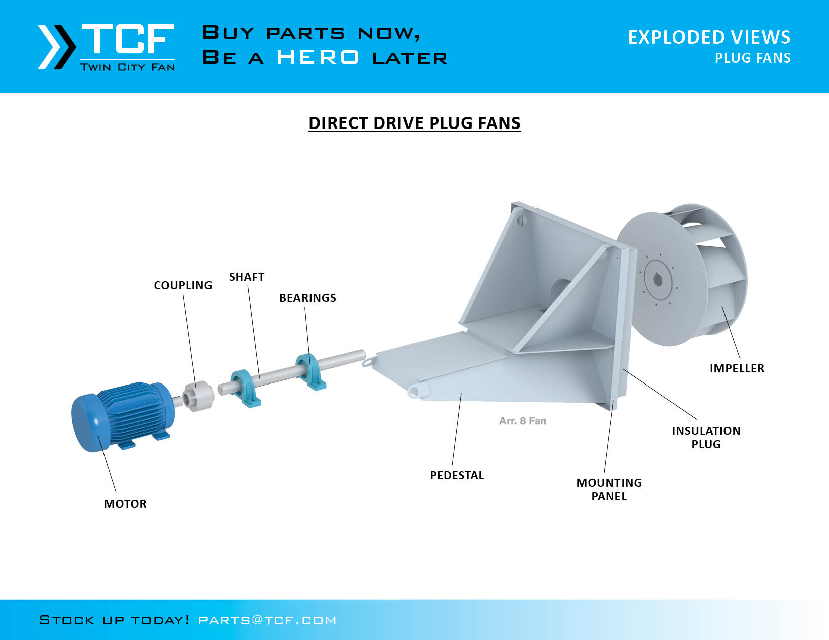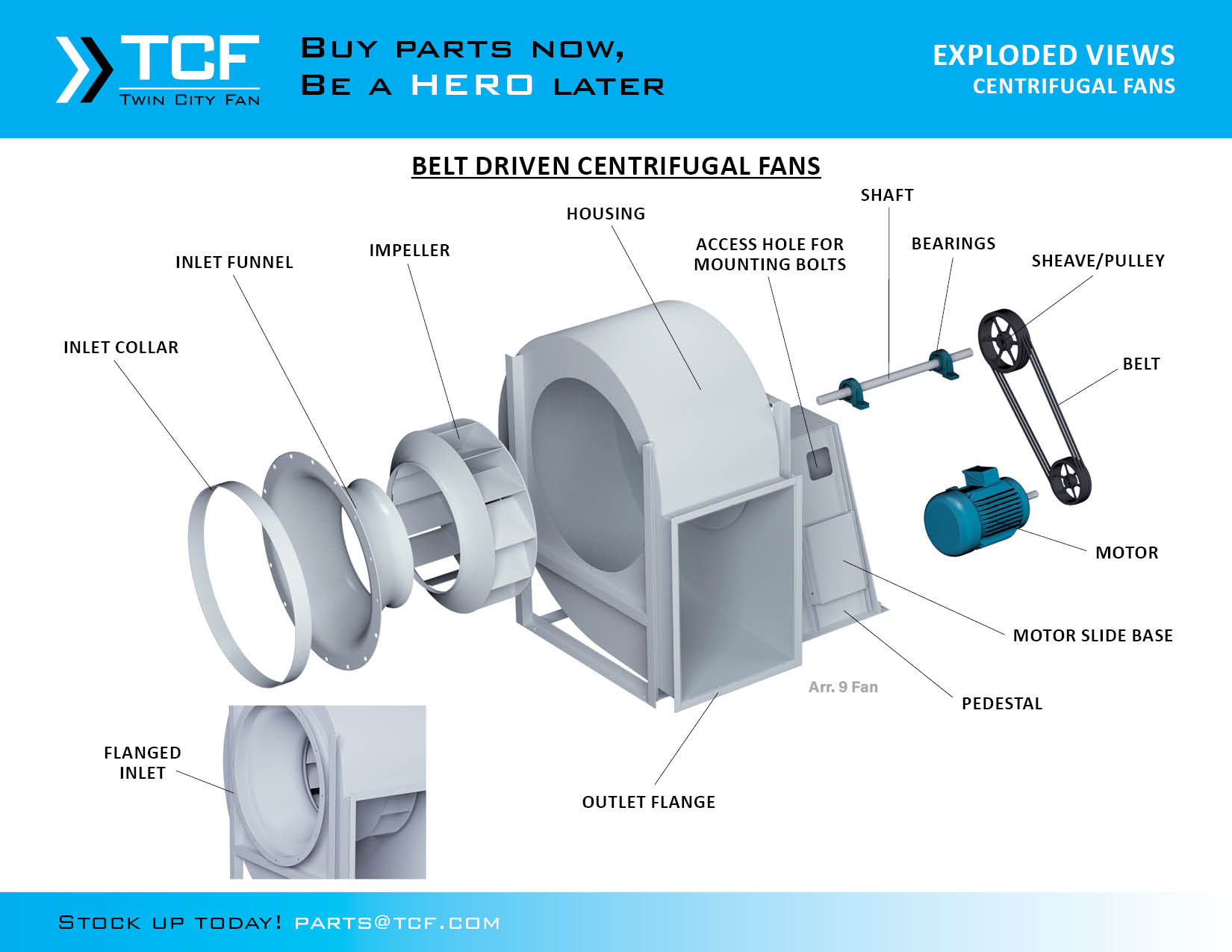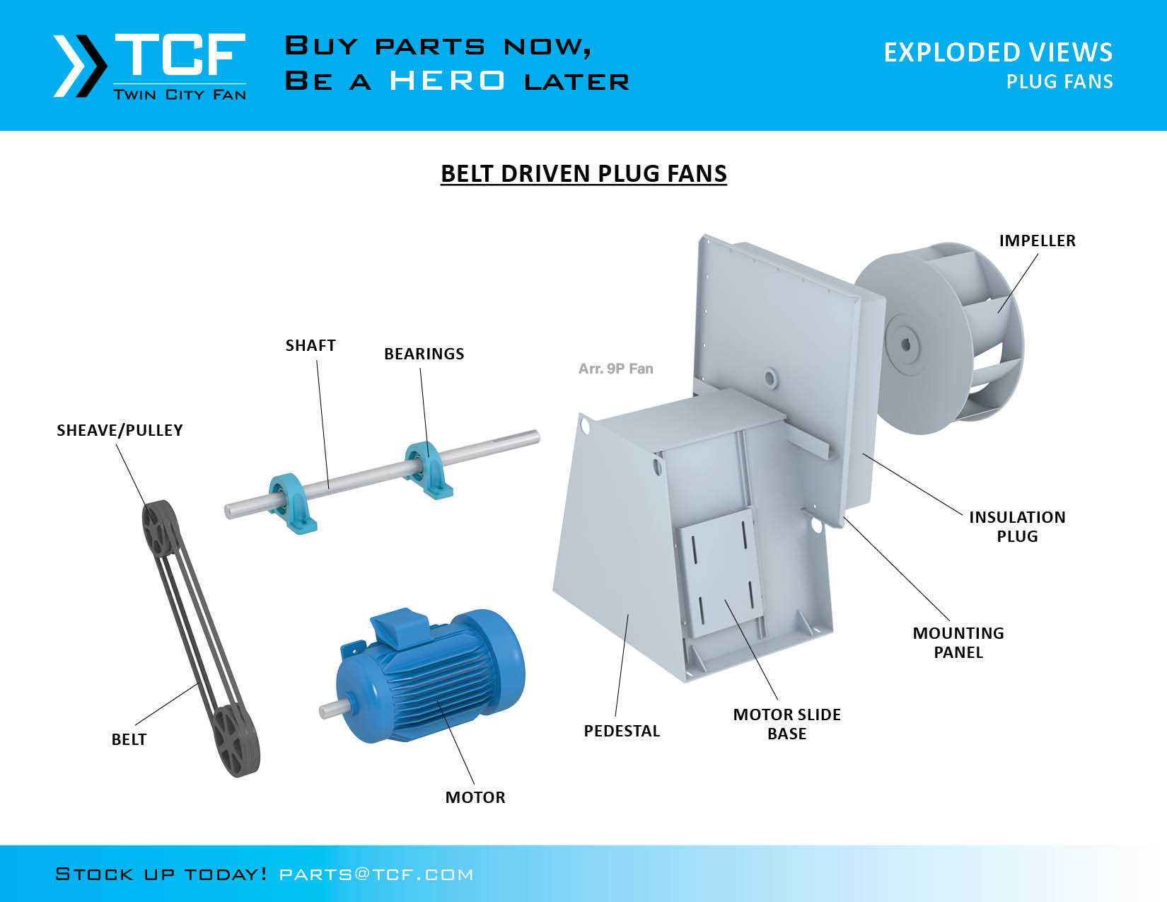 Whether you need common replacement parts or a backup supply of spare parts for process critical applications, Twin City Fan can help keep you up and running. Not sure which part you need? No problem, contact our Parts Department at 888-444-4823. Our team can assist you in selecting the right part for your fan – regardless of the manufacturer.