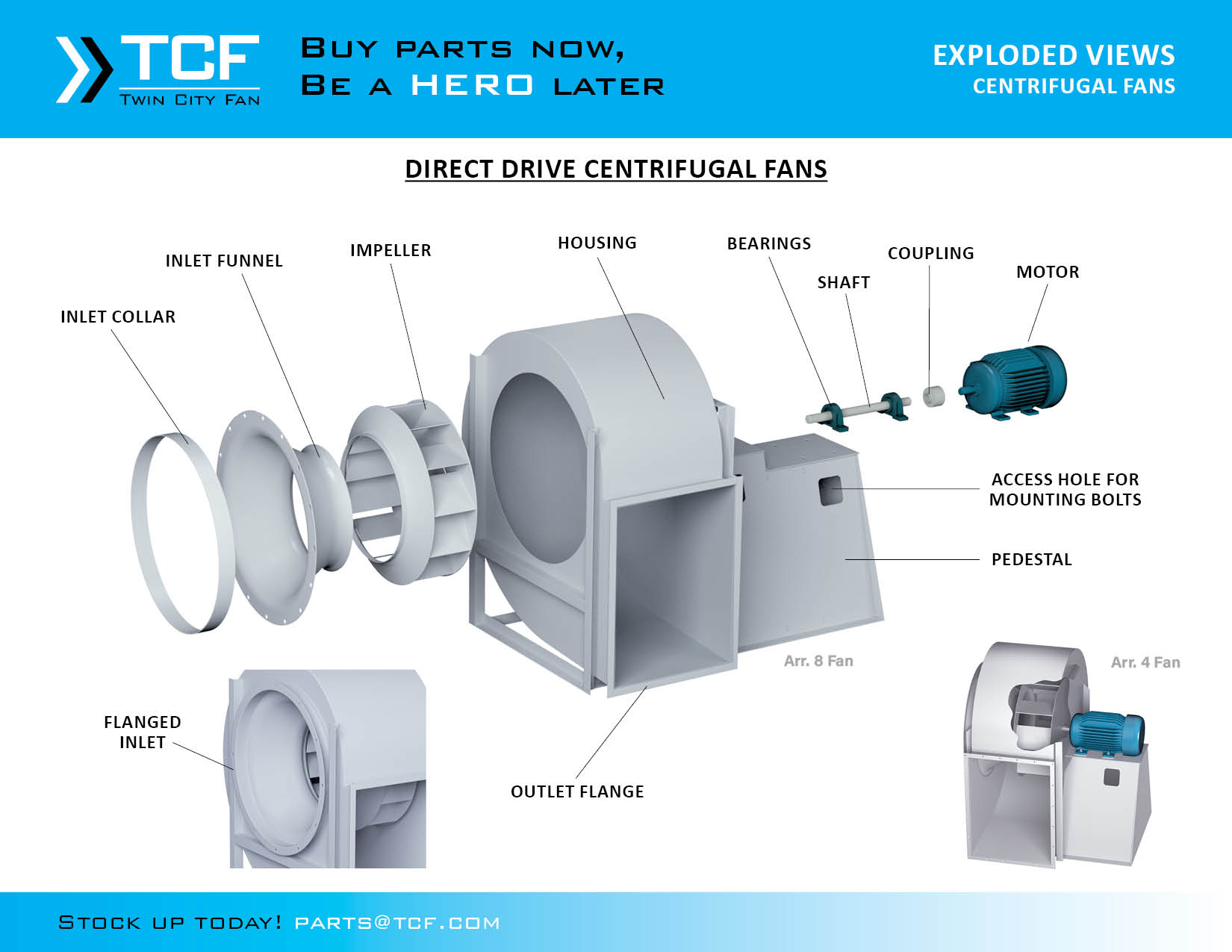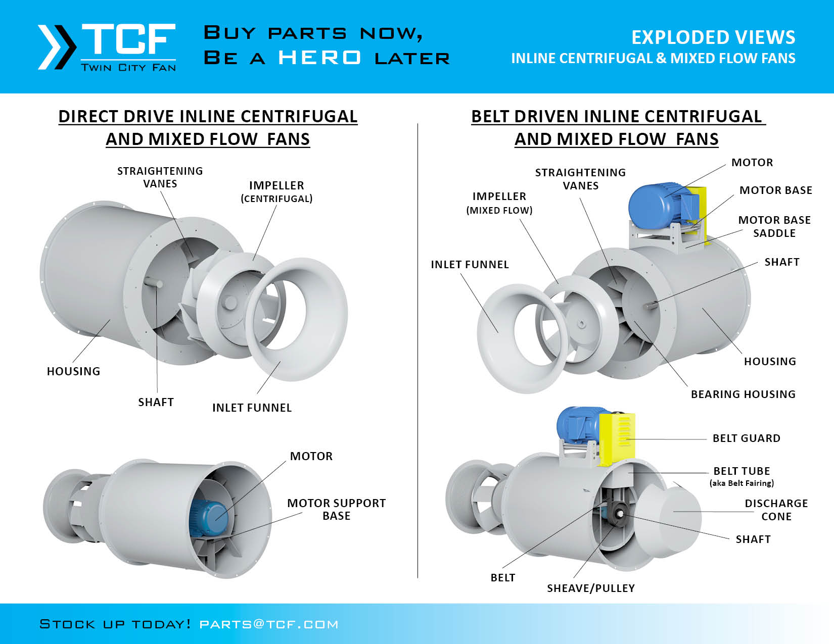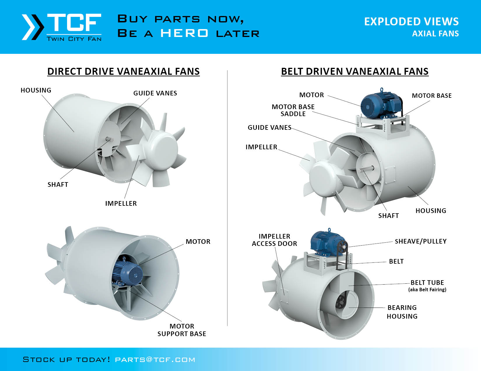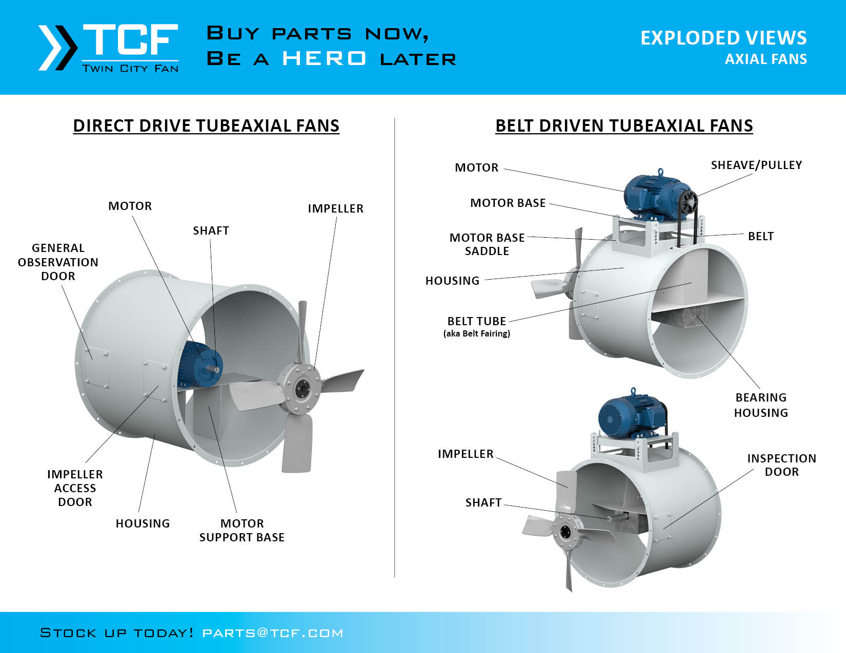 Whether you need common replacement parts or a backup supply of spare parts for process critical applications, Twin City Fan can help keep you up and running. Not sure which part you need? No problem, contact our Parts Department at 888-444-4823. Our team can assist you in selecting the right part for your fan – regardless of the manufacturer.