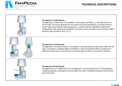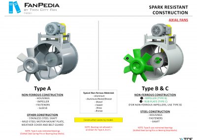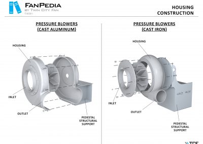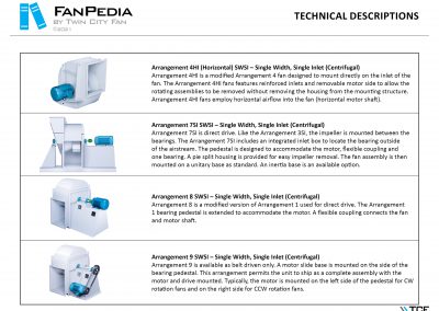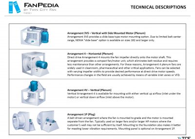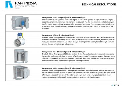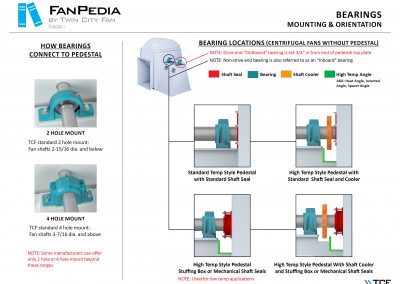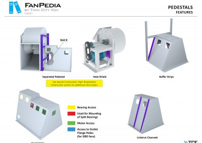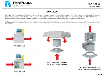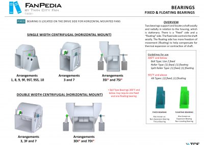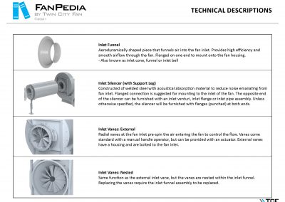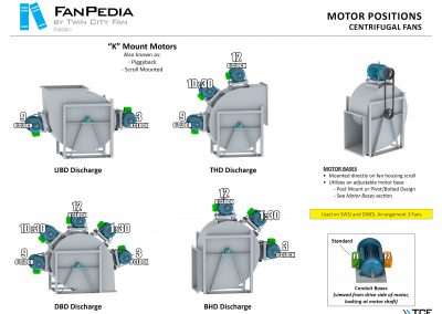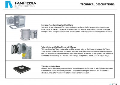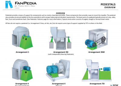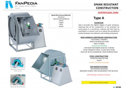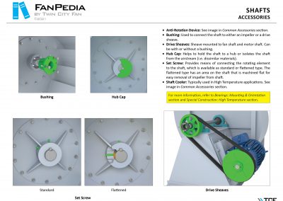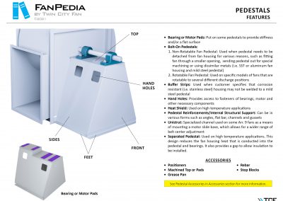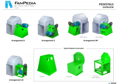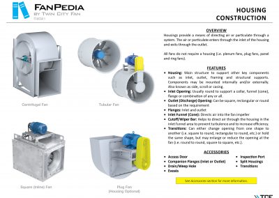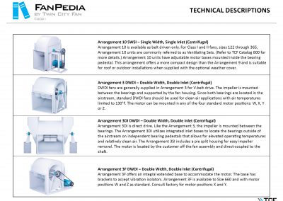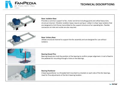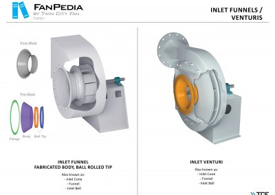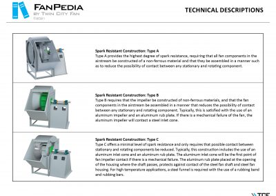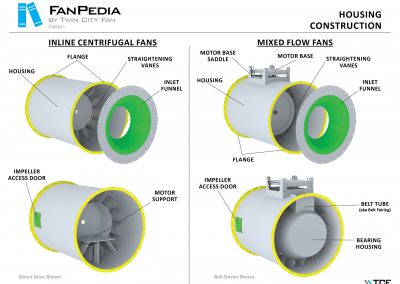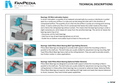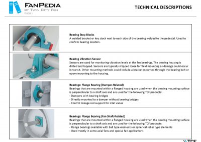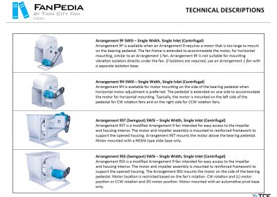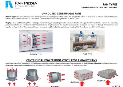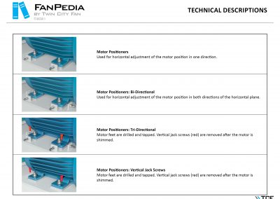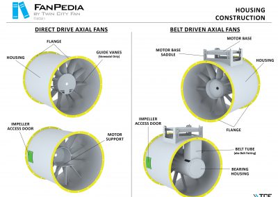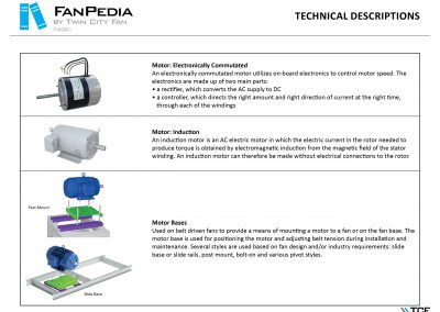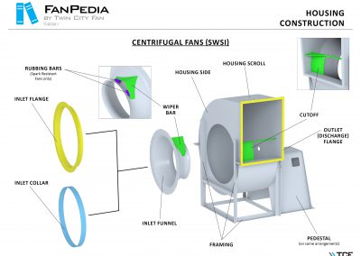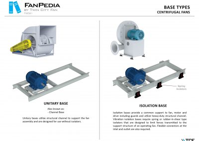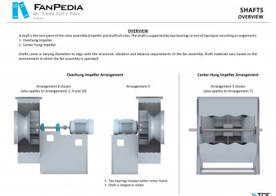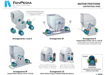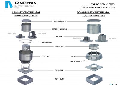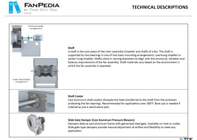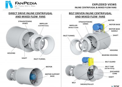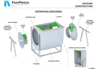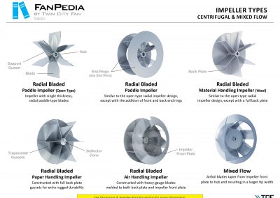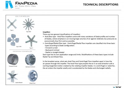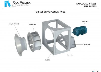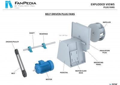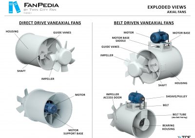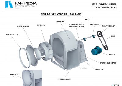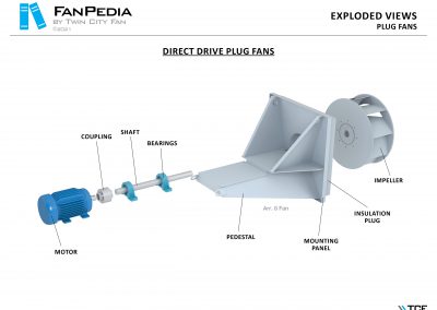 FanPedia The Fan & Blower Encyclopedia (click on thumbnails to view image galleries) Fan Basics Fan Types Exploded Views Fan Arrangements Impeller Types, Impeller Orientation & Hub Types Discharges & Impeller Rotation Impeller Airflow & Rotation (Axial Fans) Motor Positions Fan components Housing Construction Motors Motor Bases Shafts Pedestals Inlet Funnels / Venturis (Centrifugal) Bearing Types, Accessories & Modifications Fan Construction Spark Resistant Construction High Temperature Construction Insulated Fans Nominally Leak-Tight Construction RTO Construction High Moisture Construction Swingout & Clamshell Construction Fan Accessories Common Accessories Shafts Pedestals Base Types Vibration Isolation Dampers Inlet Vanes Grounding Devices Inlet Boxes Evasés Drain & Weep Holes Motor Positioners Shaft Seals Split Housings Piezometer Rings Technical Descriptions