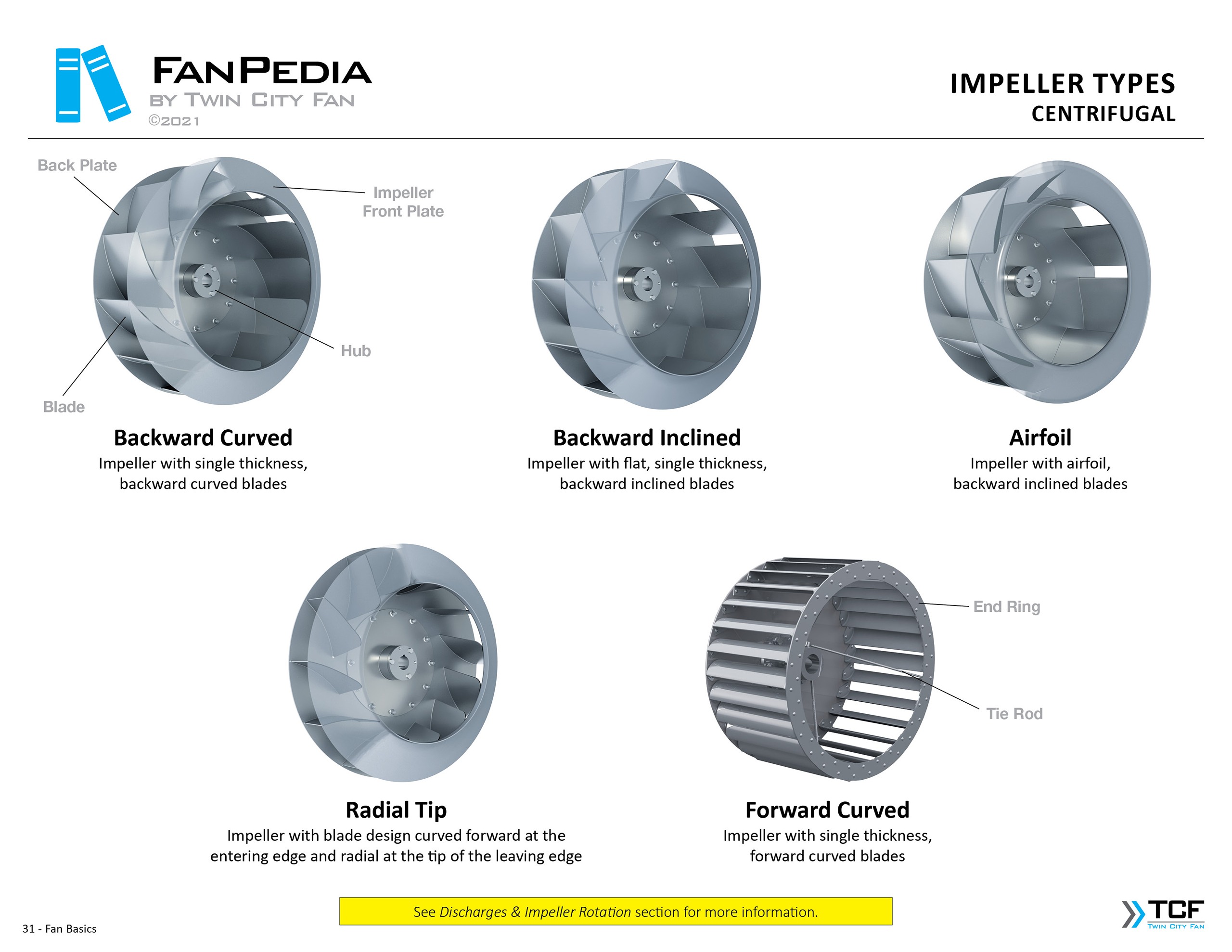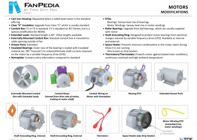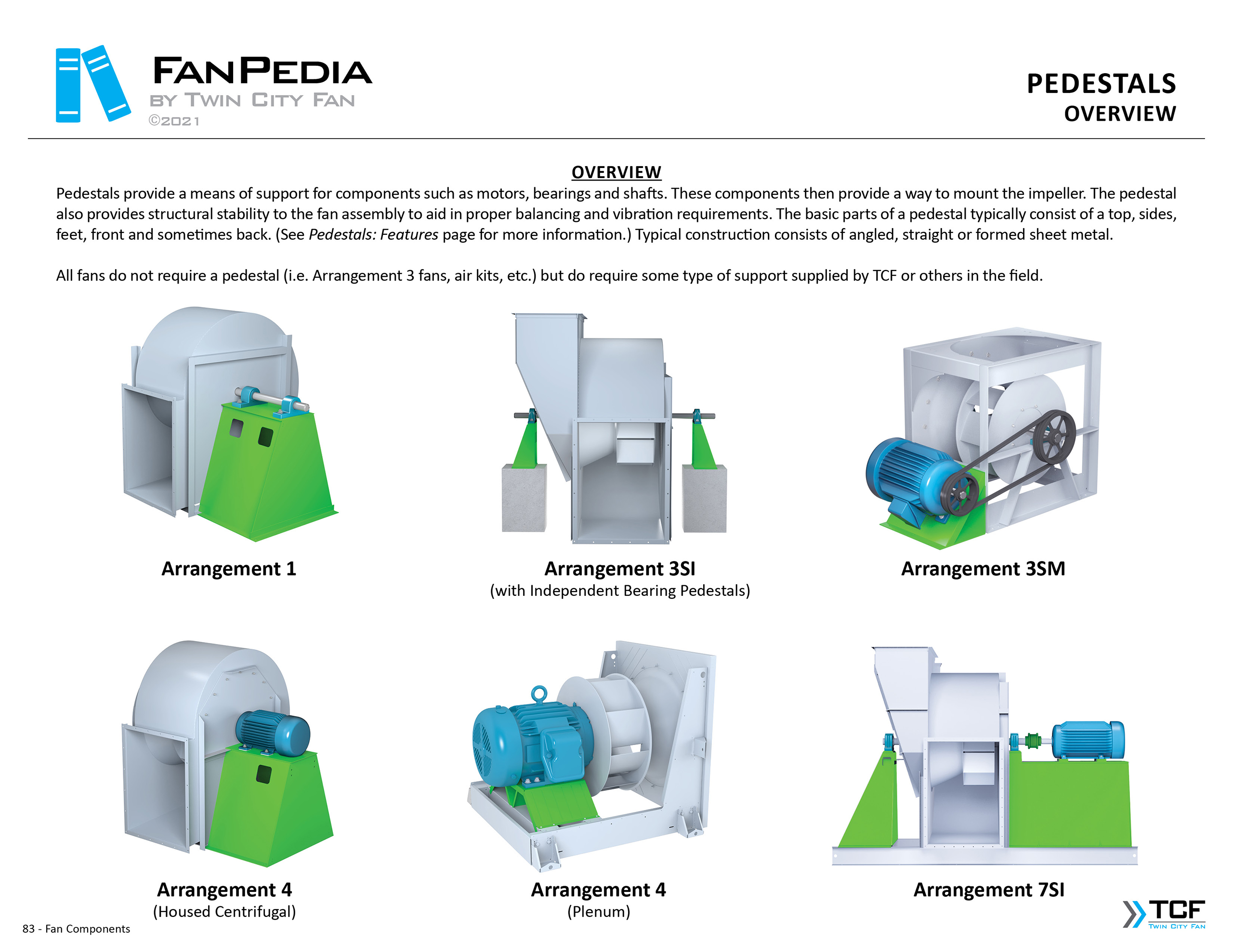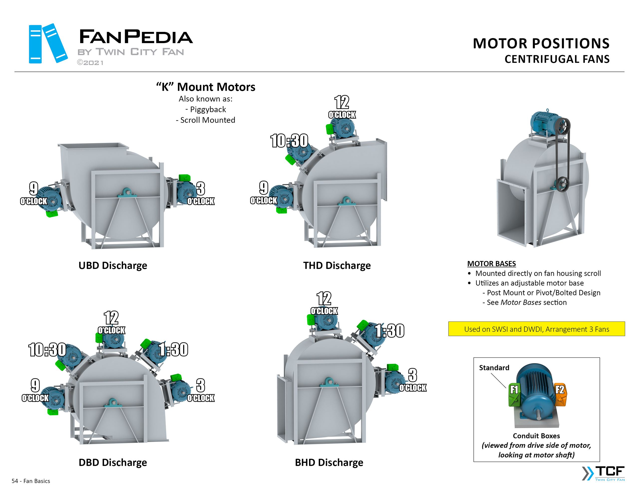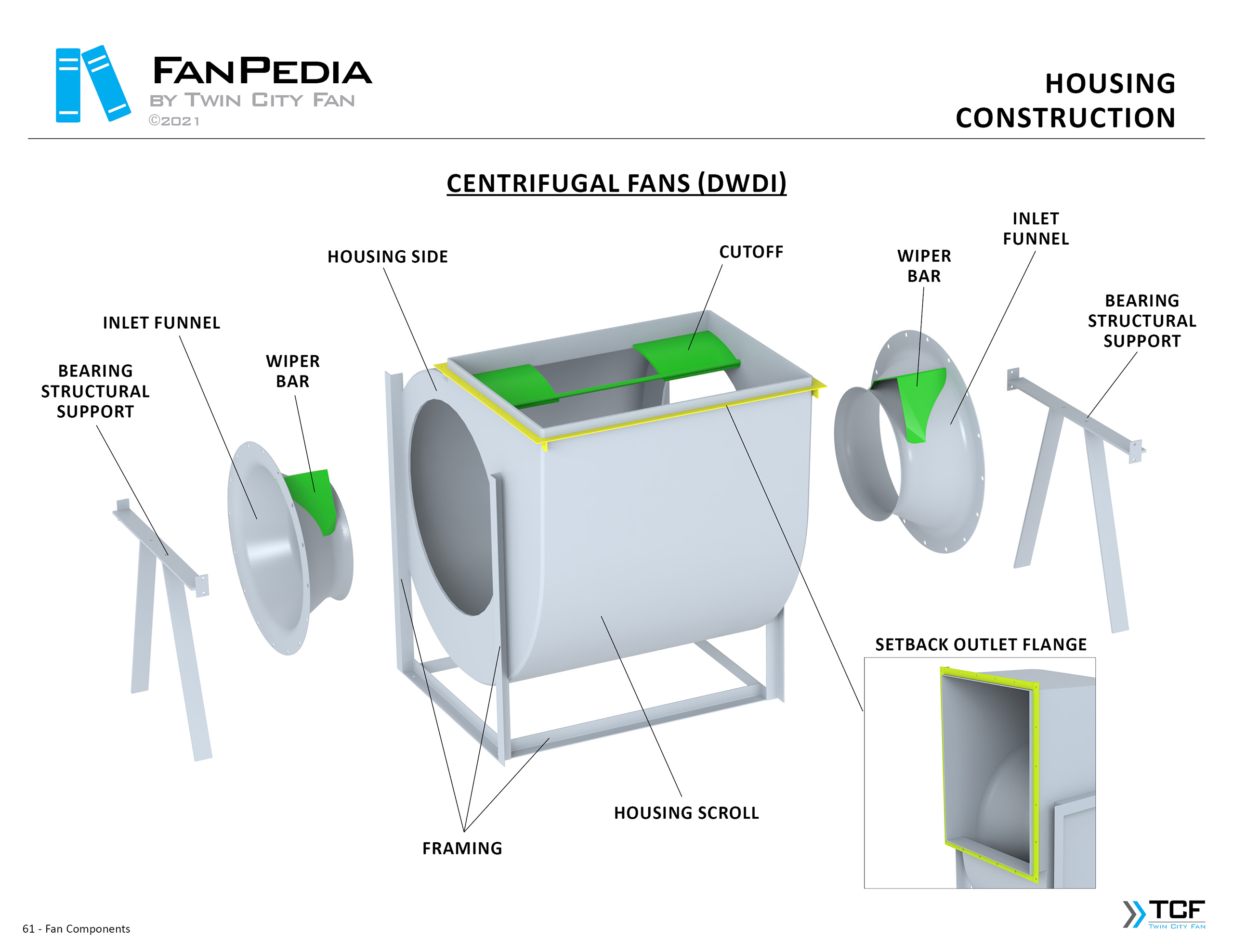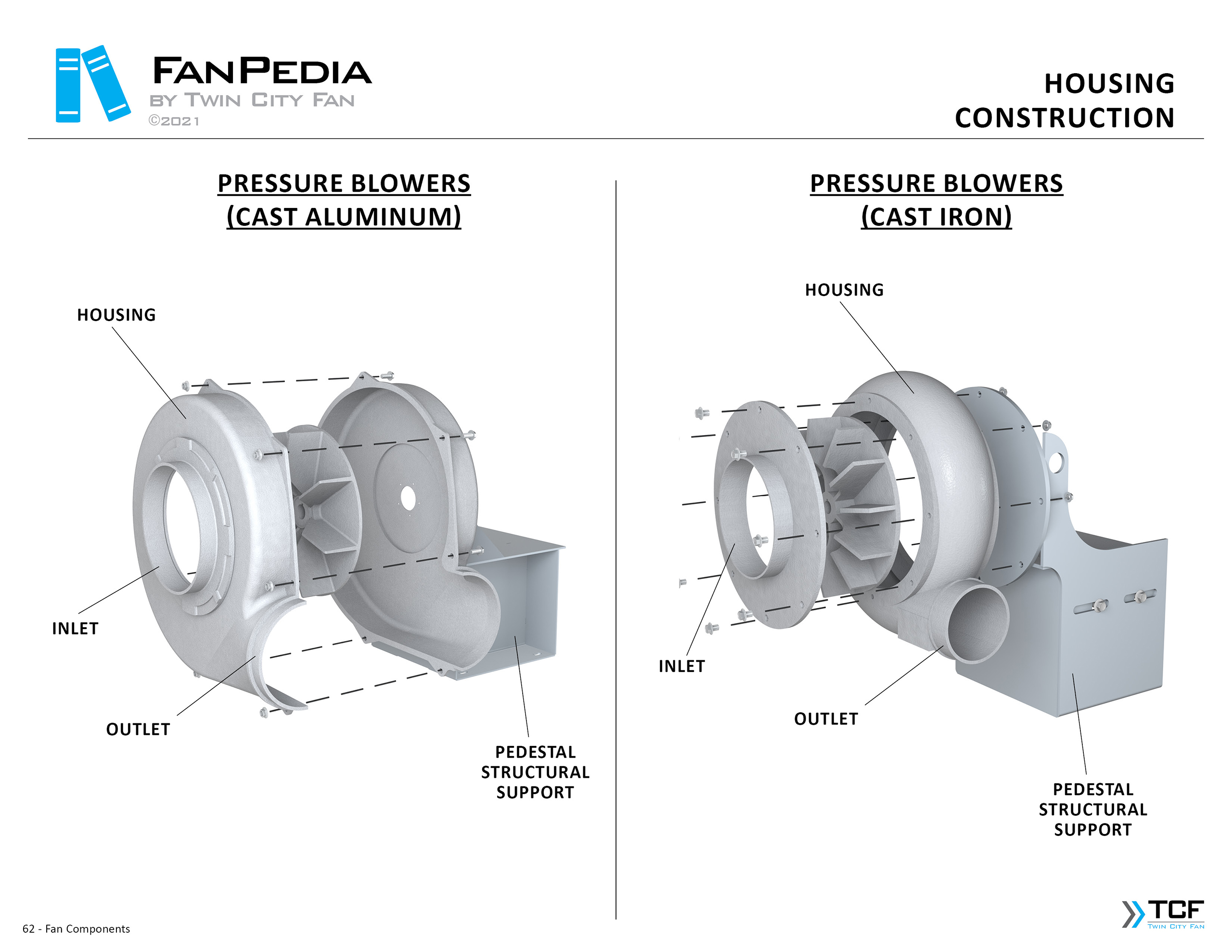 FanPedia The Fan & Blower Encyclopedia (click on thumbnails to view image galleries) Fan Basics Fan Types Exploded Views Fan Arrangements Impeller Types, Impeller Orientation & Hub Types Discharges & Impeller Rotation Impeller Airflow & Rotation (Axial Fans) Motor Positions Fan components Housing Construction Motors Motor Bases Shafts Pedestals Inlet Funnels / Venturis (Centrifugal) Bearing Types, Accessories & Modifications Fan Construction Spark Resistant Construction High Temperature Construction Insulated Fans Nominally Leak-Tight Construction RTO Construction High Moisture Construction Swingout & Clamshell Construction Fan Accessories Common Accessories Shafts Pedestals Base Types Vibration Isolation Dampers Inlet Vanes Grounding Devices Inlet Boxes Evasés Drain & Weep Holes Motor Positioners Shaft Seals Split Housings Piezometer Rings Technical Descriptions