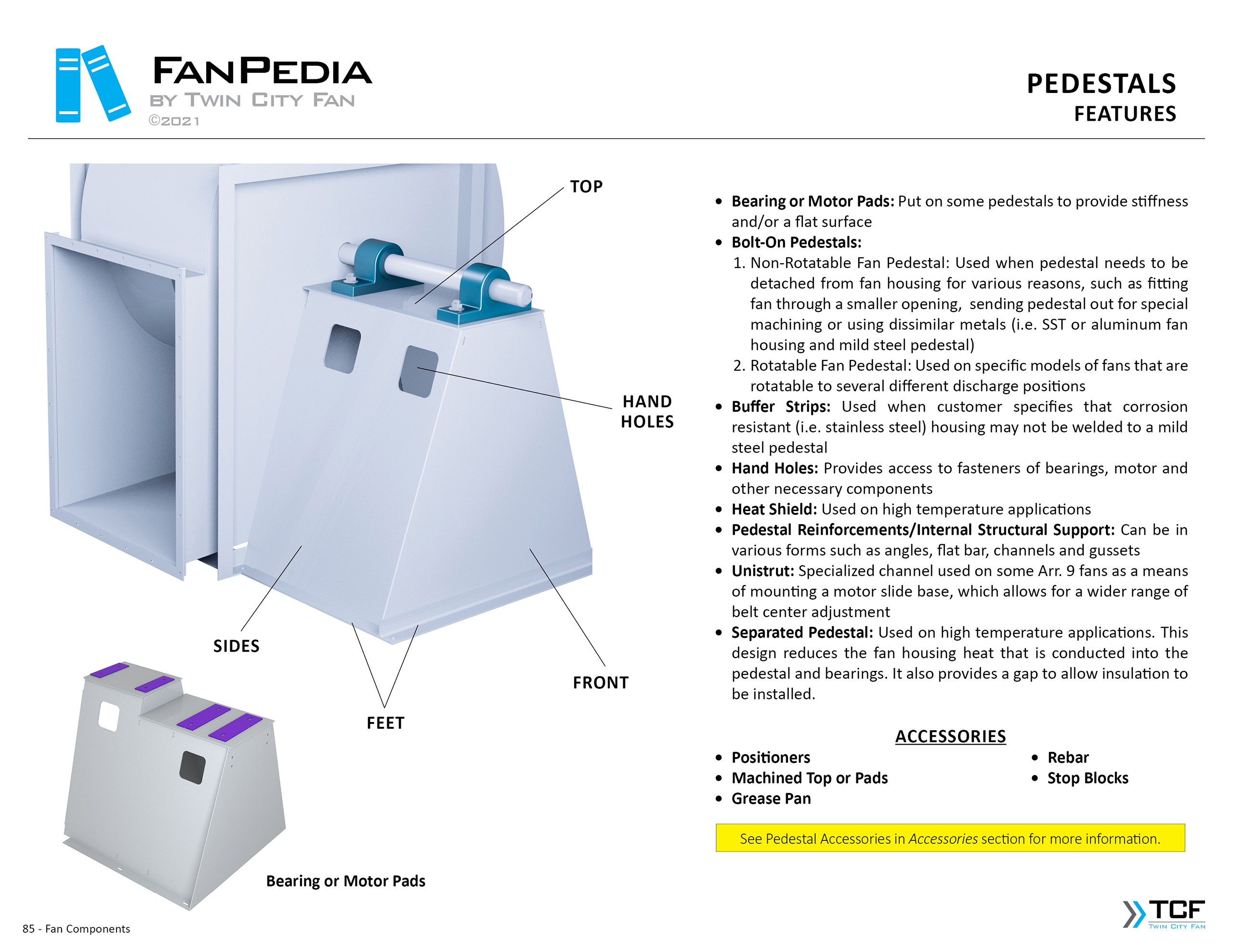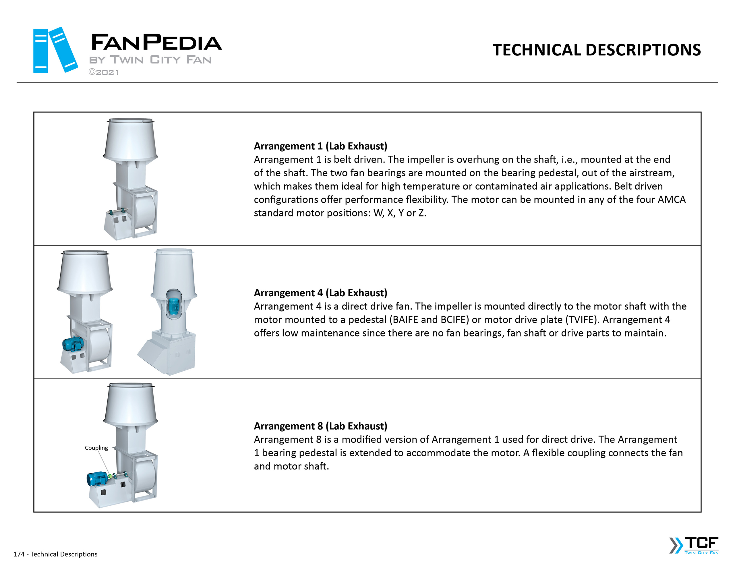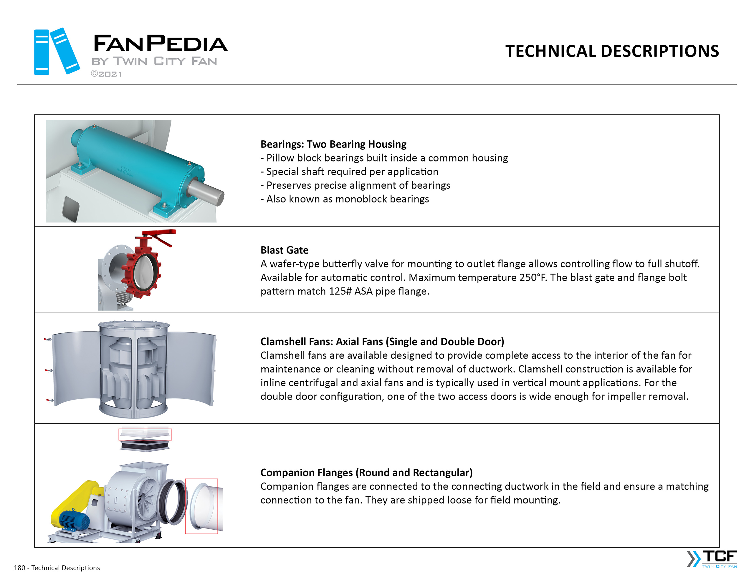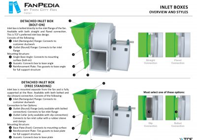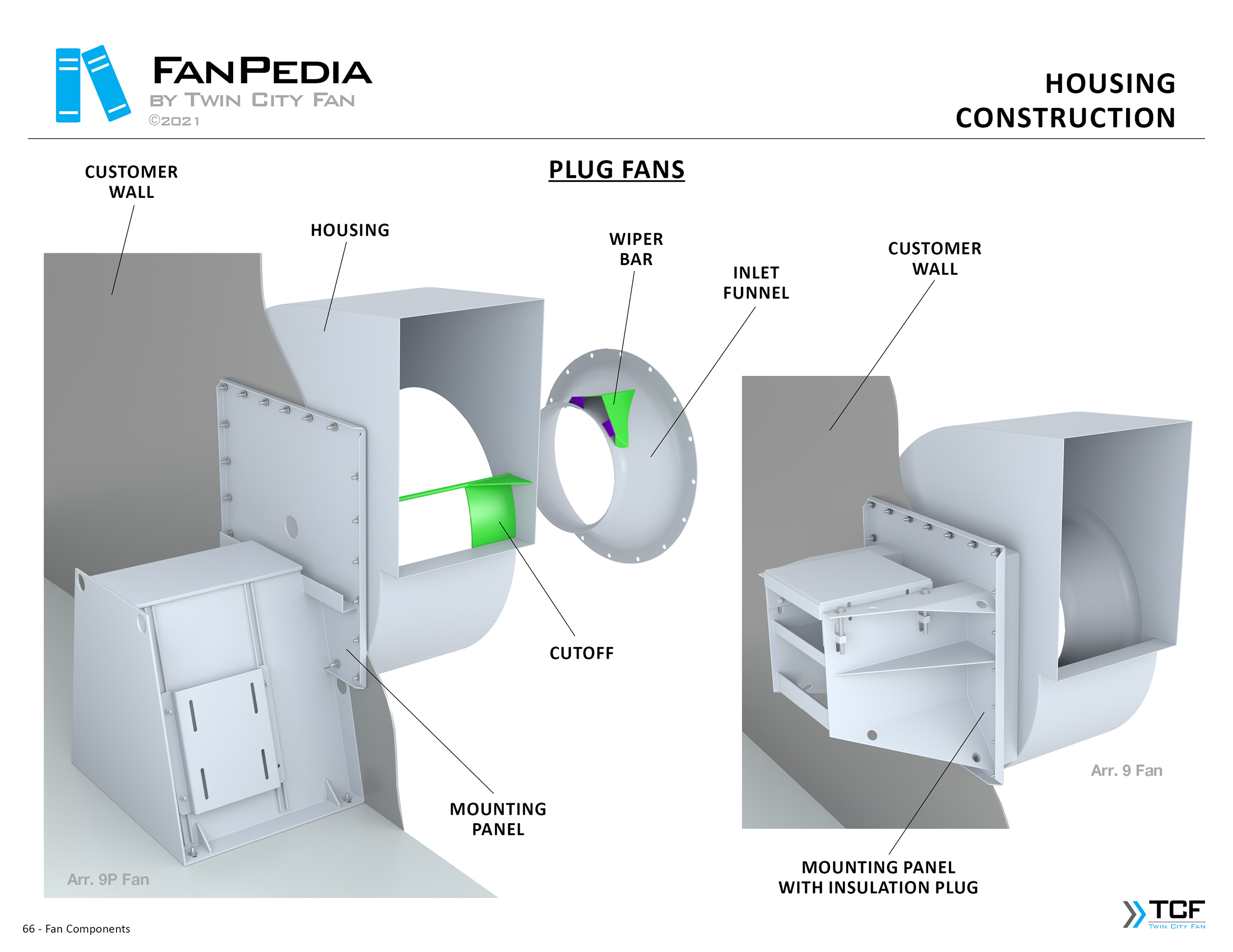 FanPedia The Fan & Blower Encyclopedia (click on thumbnails to view image galleries) Fan Basics Fan Types Exploded Views Fan Arrangements Impeller Types, Impeller Orientation & Hub Types Discharges & Impeller Rotation Impeller Airflow & Rotation (Axial Fans) Motor Positions Fan components Housing Construction Motors Motor Bases Shafts Pedestals Inlet Funnels / Venturis (Centrifugal) Bearing Types, Accessories & Modifications Fan Construction Spark Resistant Construction High Temperature Construction Insulated Fans Nominally Leak-Tight Construction RTO Construction High Moisture Construction Swingout & Clamshell Construction Fan Accessories Common Accessories Shafts Pedestals Base Types Vibration Isolation Dampers Inlet Vanes Grounding Devices Inlet Boxes Evasés Drain & Weep Holes Motor Positioners Shaft Seals Split Housings Piezometer Rings Technical Descriptions
