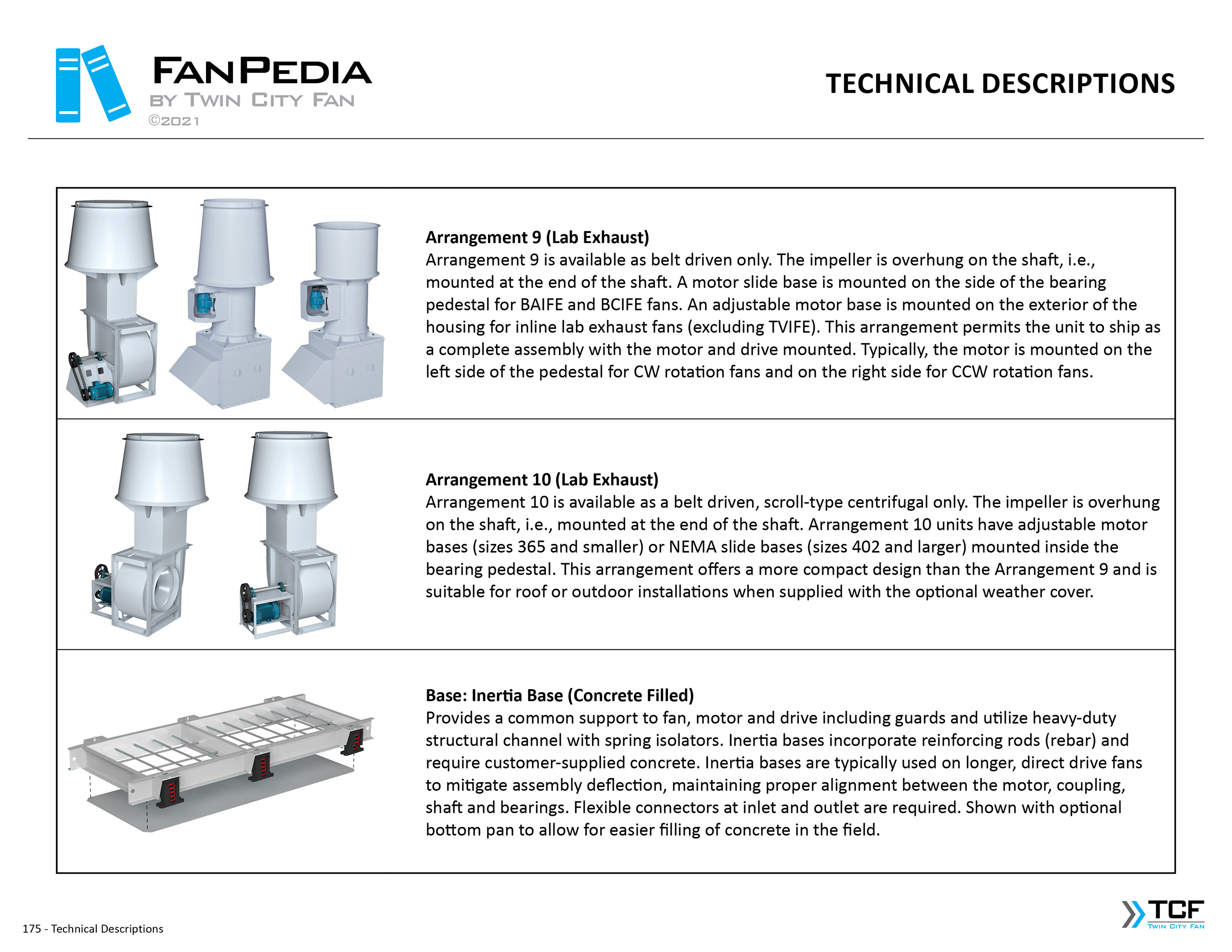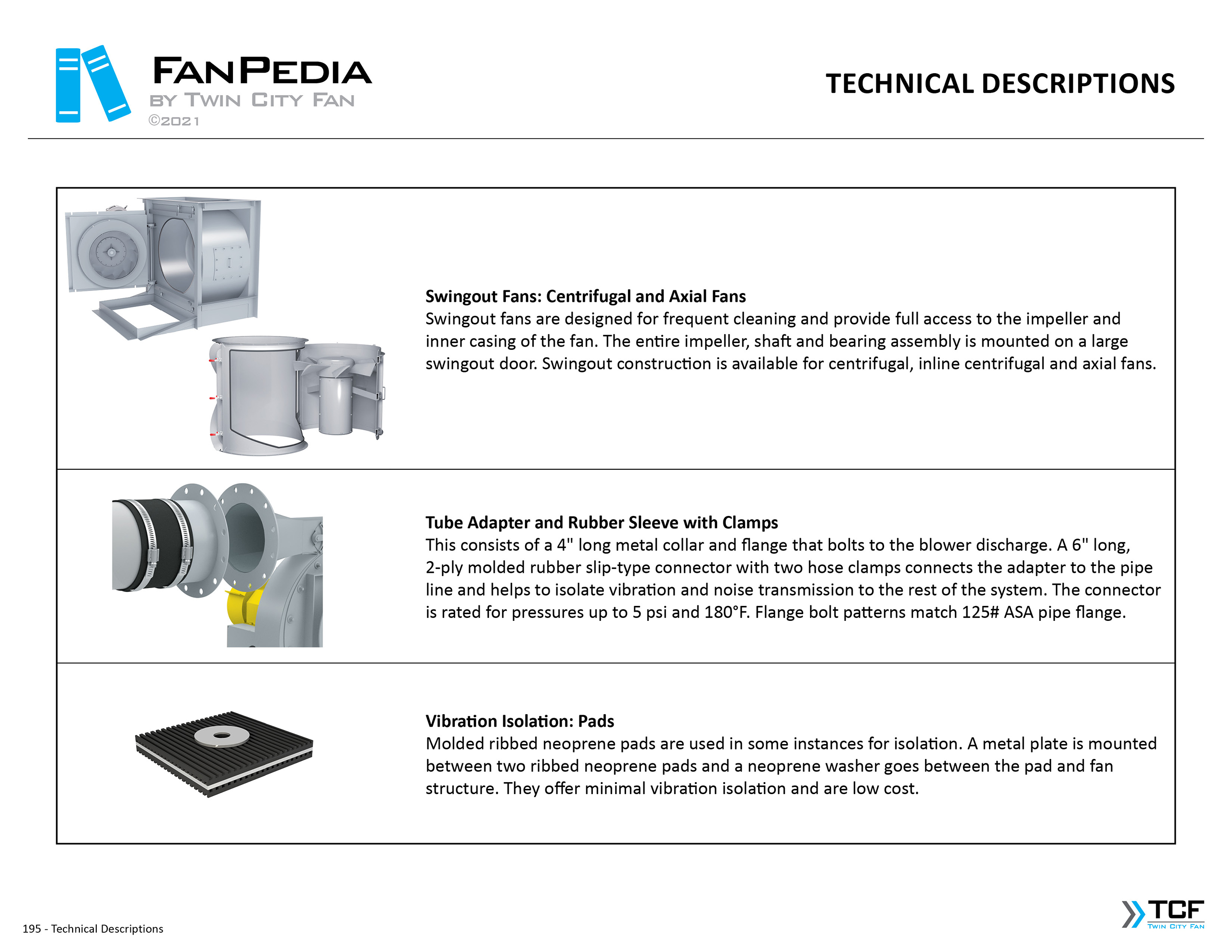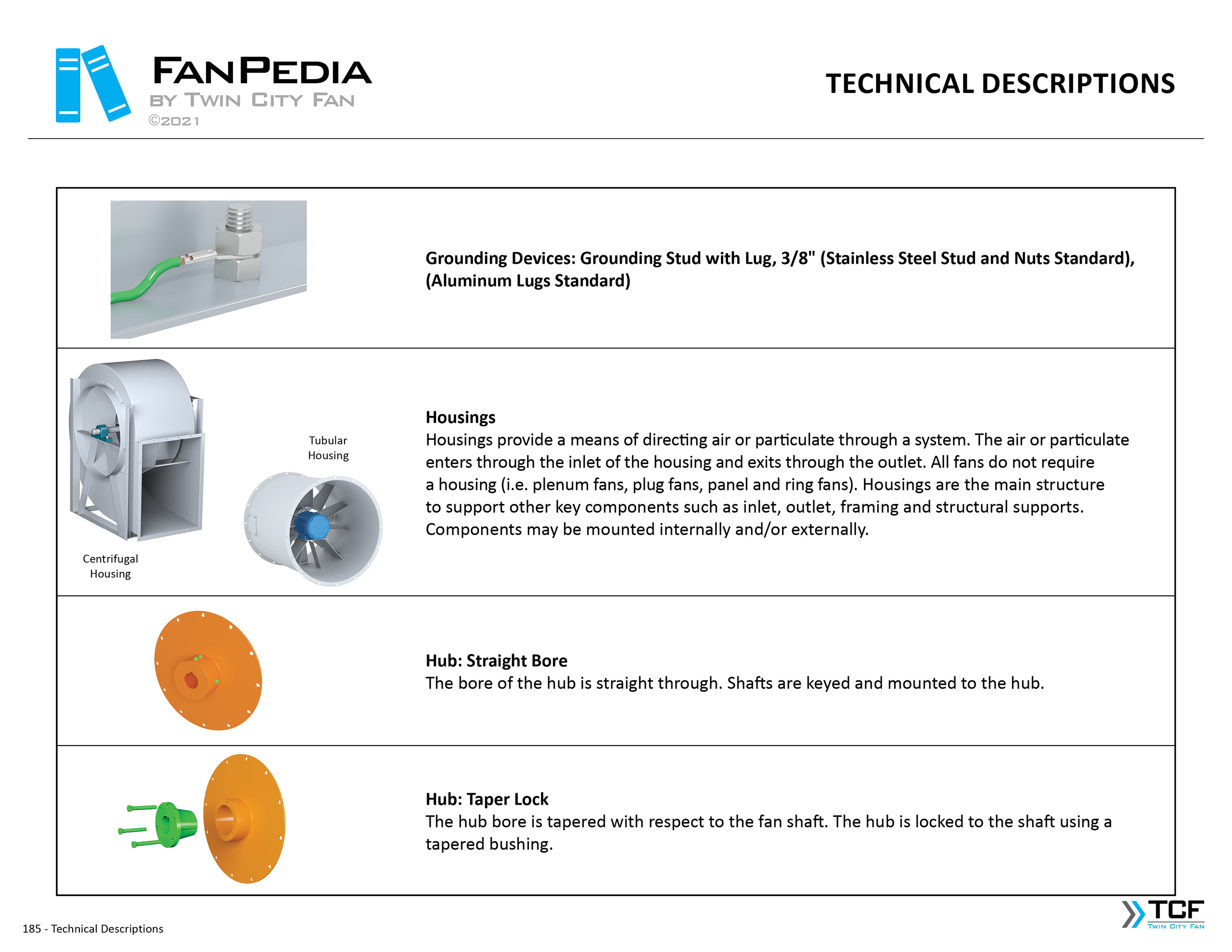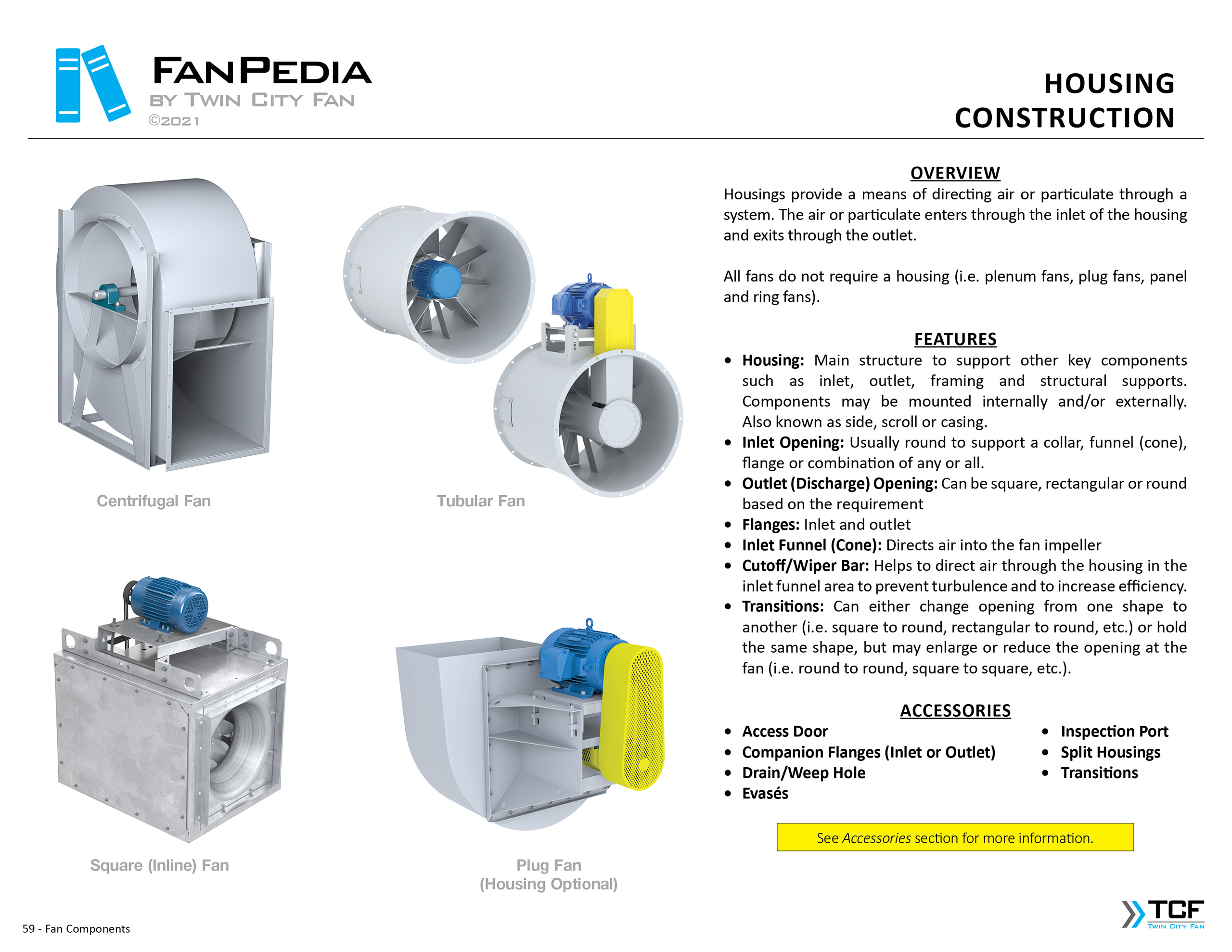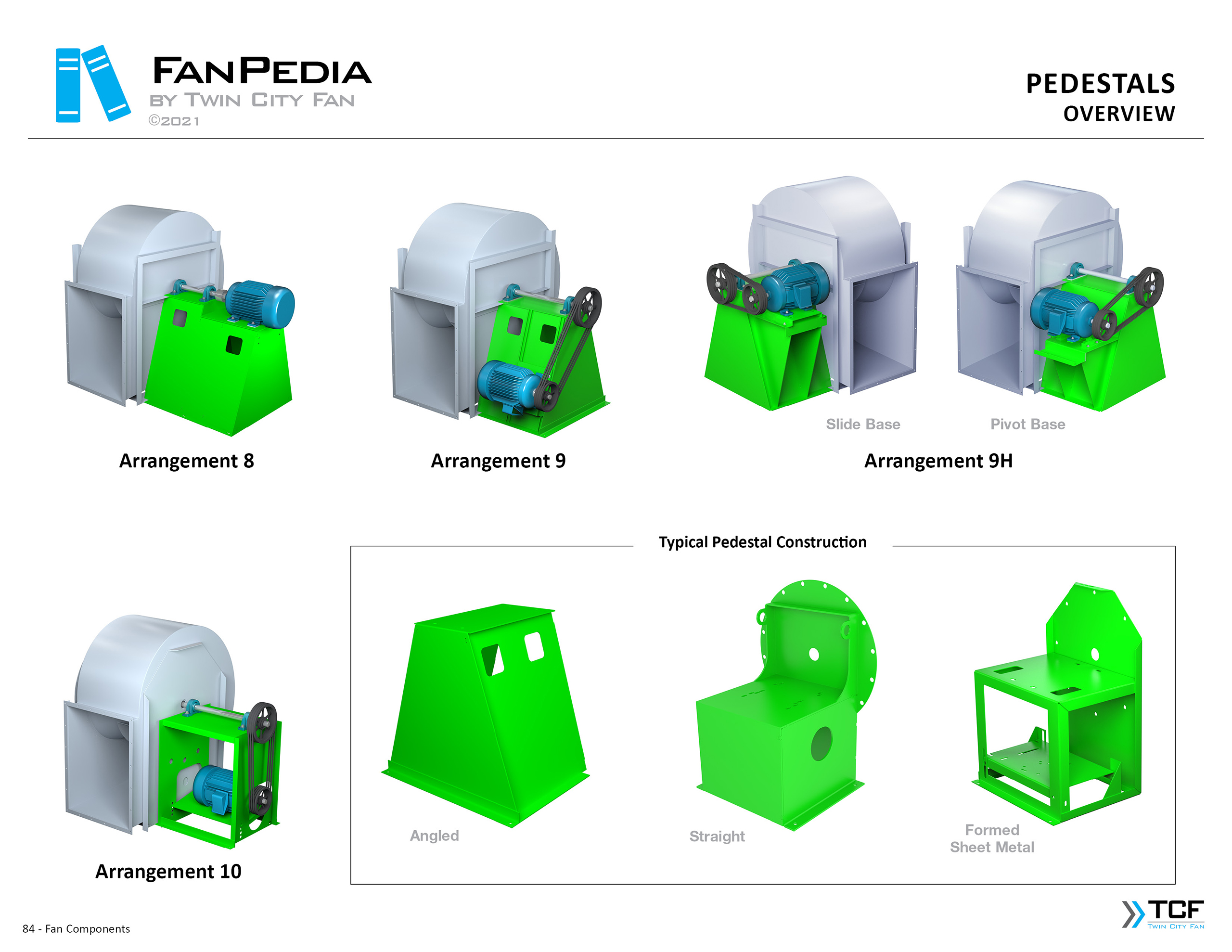 FanPedia The Fan & Blower Encyclopedia (click on thumbnails to view image galleries) Fan Basics Fan Types Exploded Views Fan Arrangements Impeller Types, Impeller Orientation & Hub Types Discharges & Impeller Rotation Impeller Airflow & Rotation (Axial Fans) Motor Positions Fan components Housing Construction Motors Motor Bases Shafts Pedestals Inlet Funnels / Venturis (Centrifugal) Bearing Types, Accessories & Modifications Fan Construction Spark Resistant Construction High Temperature Construction Insulated Fans Nominally Leak-Tight Construction RTO Construction High Moisture Construction Swingout & Clamshell Construction Fan Accessories Common Accessories Shafts Pedestals Base Types Vibration Isolation Dampers Inlet Vanes Grounding Devices Inlet Boxes Evasés Drain & Weep Holes Motor Positioners Shaft Seals Split Housings Piezometer Rings Technical Descriptions