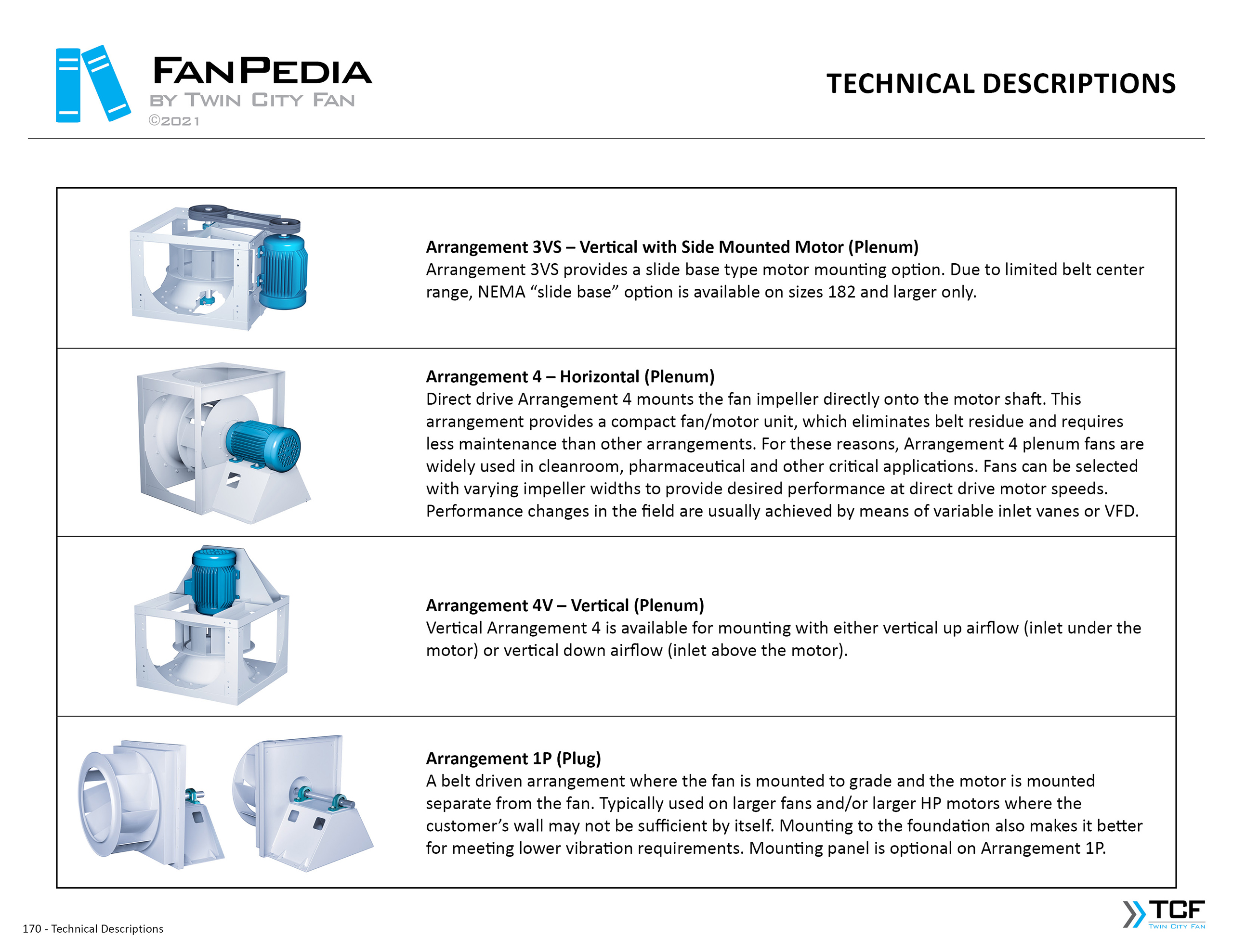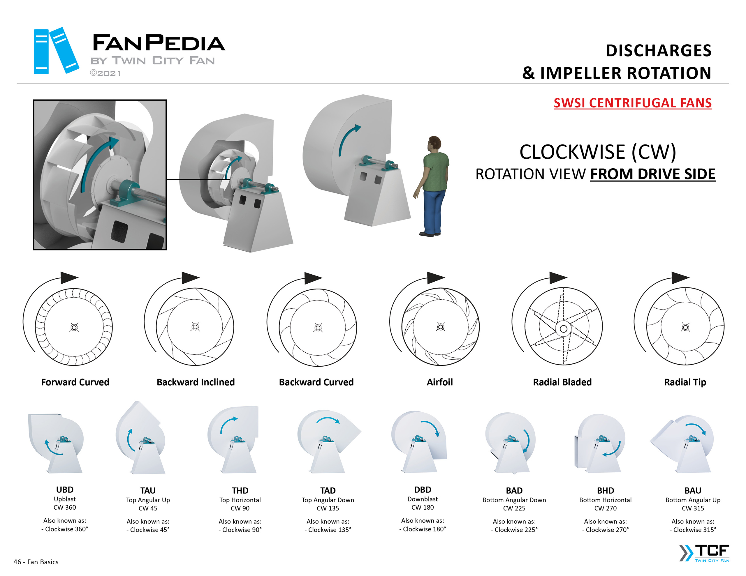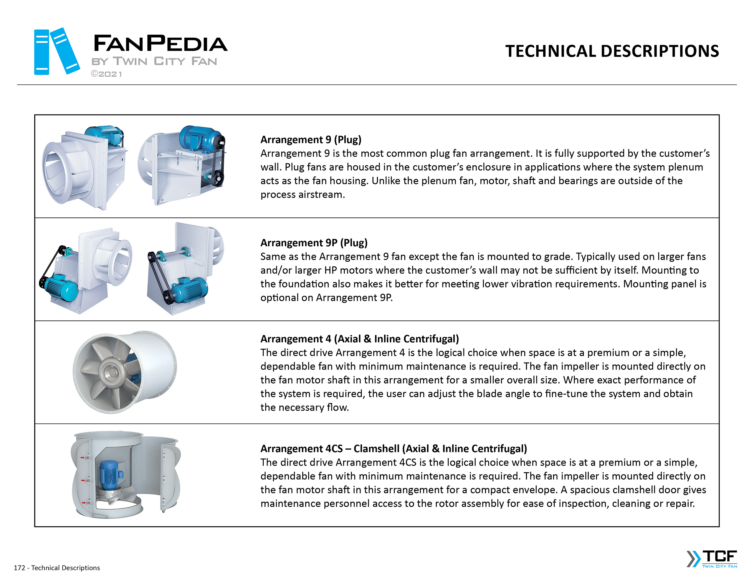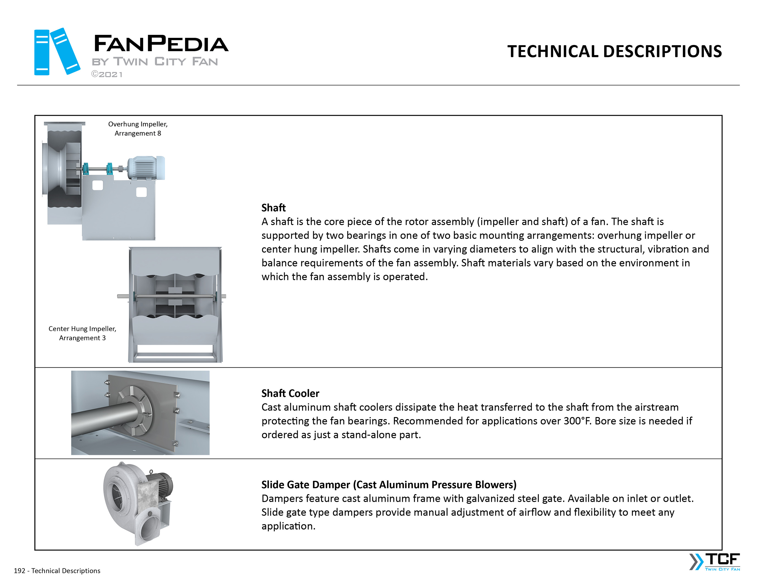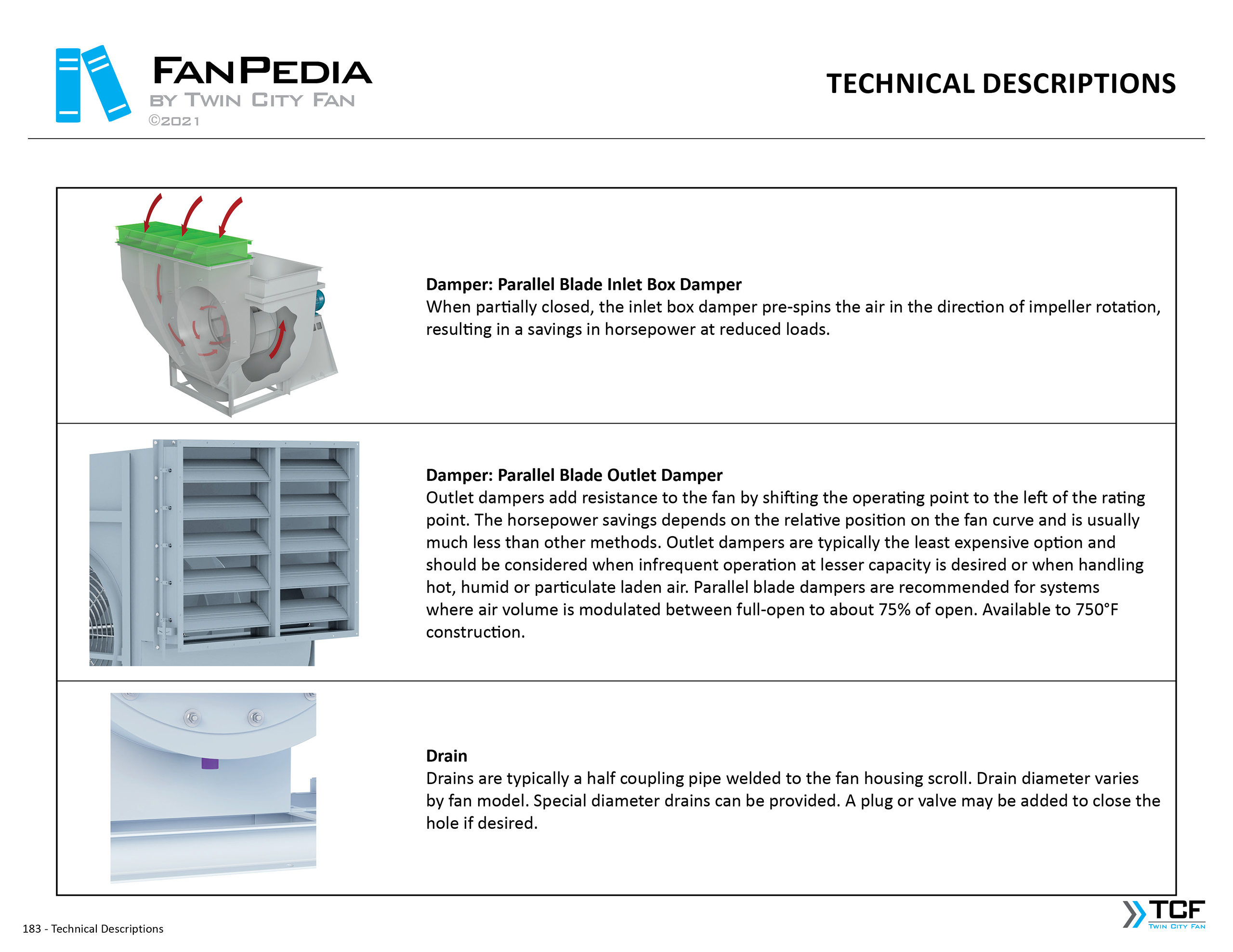 FanPedia The Fan & Blower Encyclopedia (click on thumbnails to view image galleries) Fan Basics Fan Types Exploded Views Fan Arrangements Impeller Types, Impeller Orientation & Hub Types Discharges & Impeller Rotation Impeller Airflow & Rotation (Axial Fans) Motor Positions Fan components Housing Construction Motors Motor Bases Shafts Pedestals Inlet Funnels / Venturis (Centrifugal) Bearing Types, Accessories & Modifications Fan Construction Spark Resistant Construction High Temperature Construction Insulated Fans Nominally Leak-Tight Construction RTO Construction High Moisture Construction Swingout & Clamshell Construction Fan Accessories Common Accessories Shafts Pedestals Base Types Vibration Isolation Dampers Inlet Vanes Grounding Devices Inlet Boxes Evasés Drain & Weep Holes Motor Positioners Shaft Seals Split Housings Piezometer Rings Technical Descriptions
