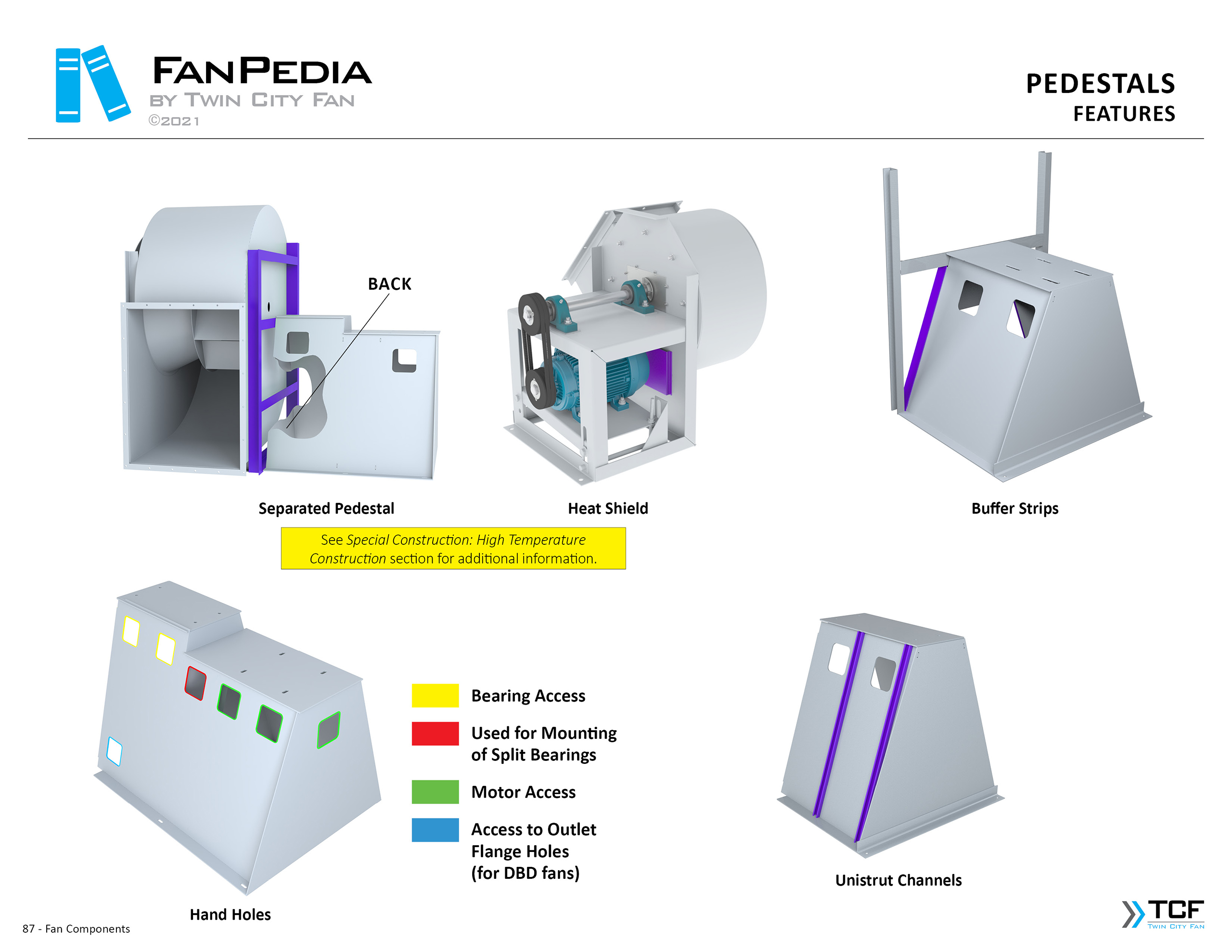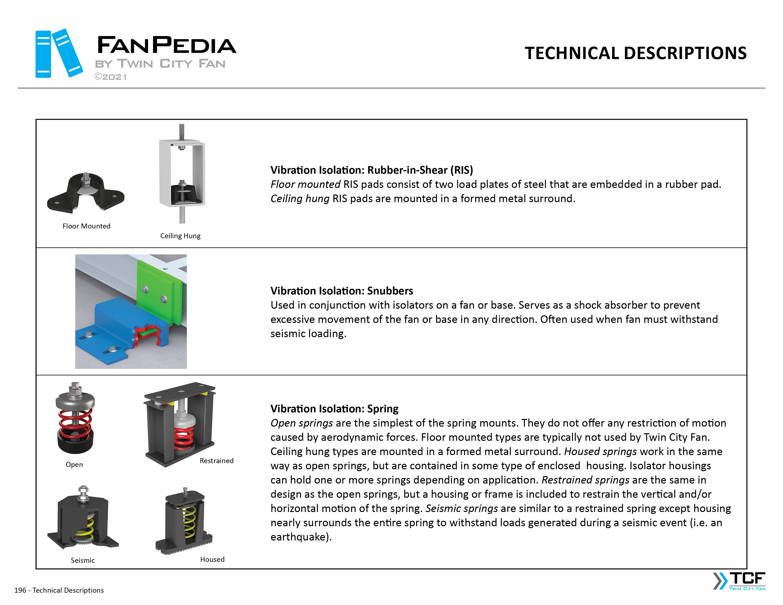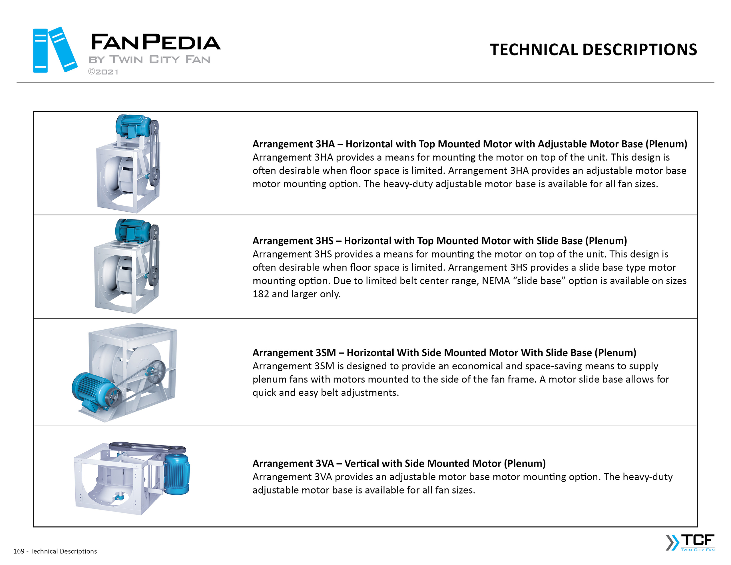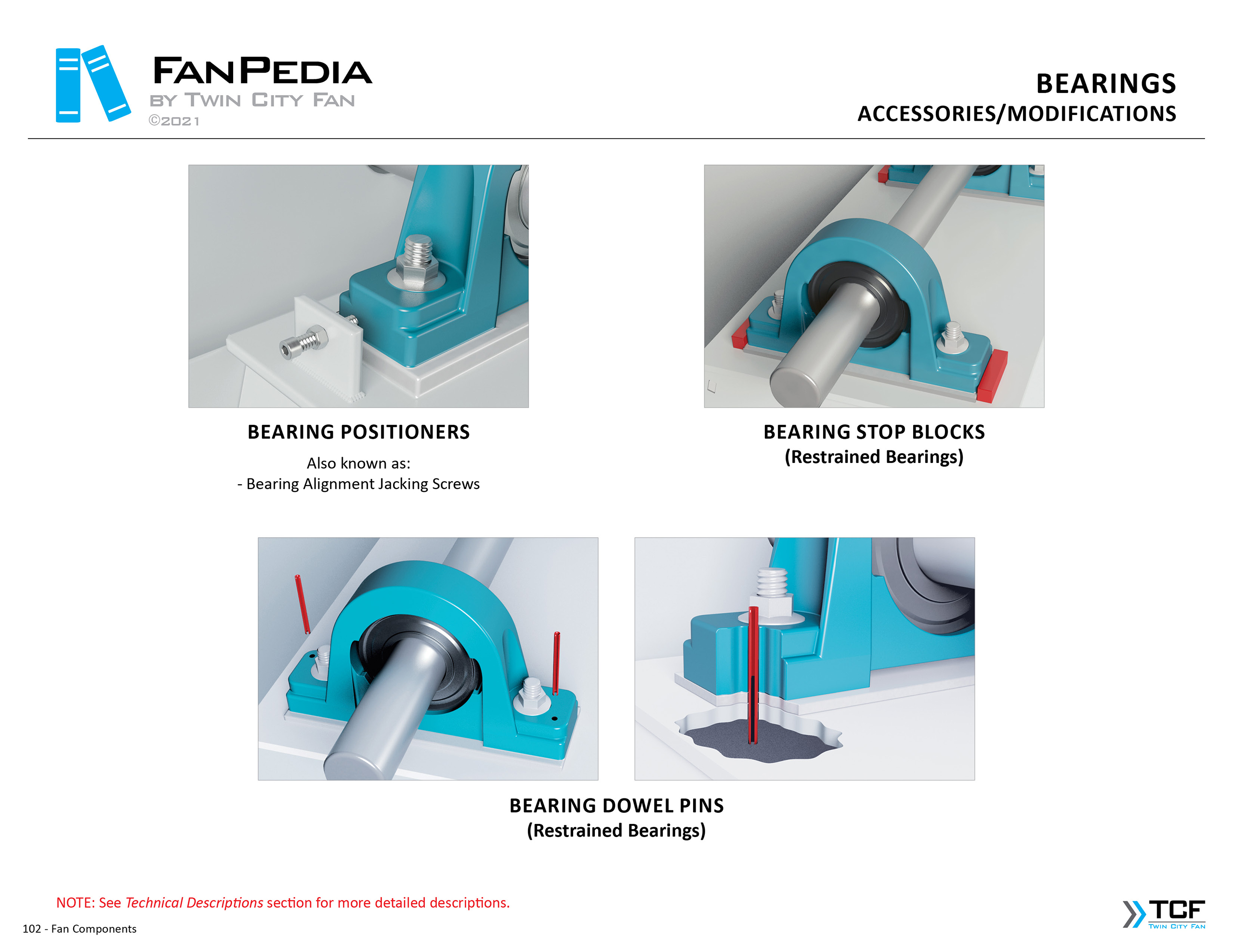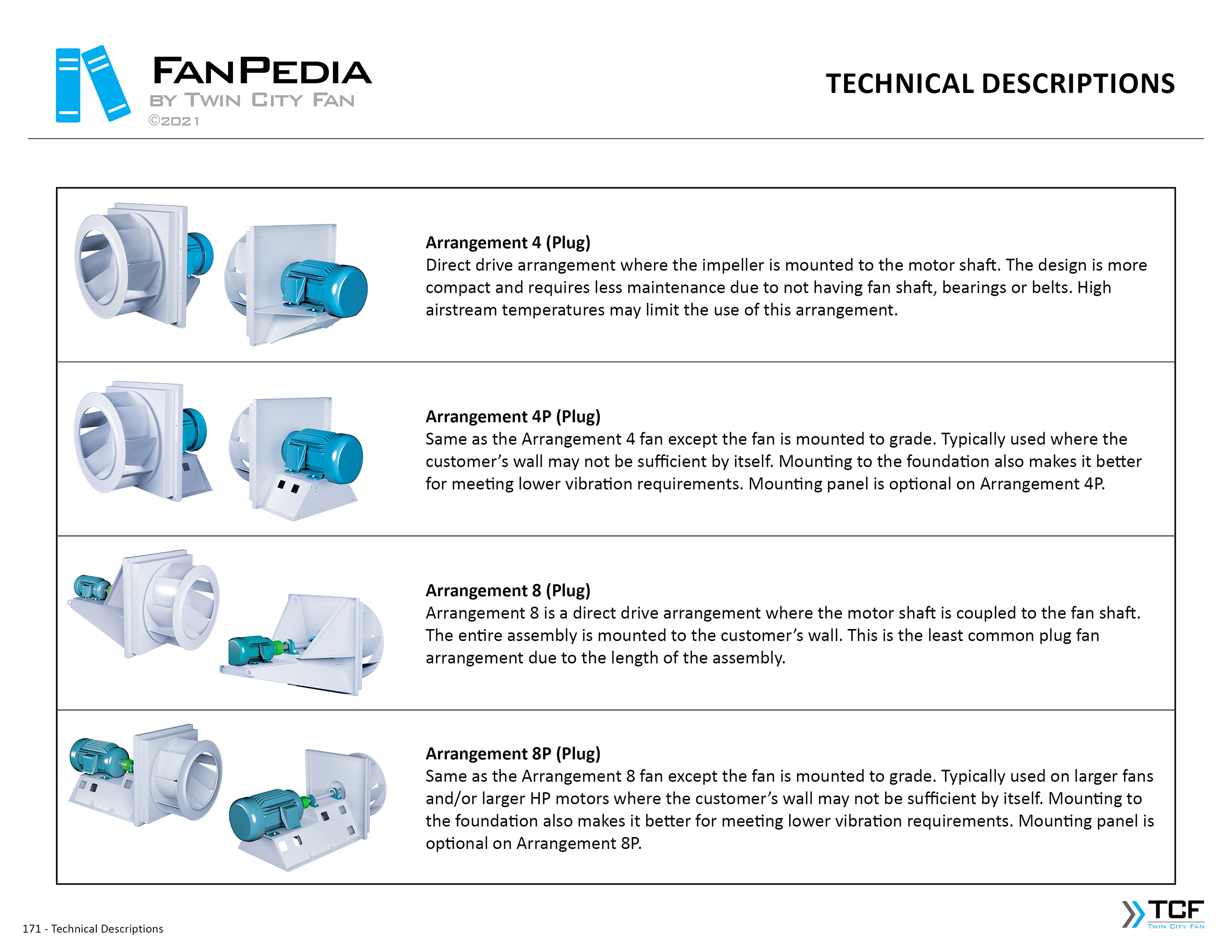 FanPedia The Fan & Blower Encyclopedia (click on thumbnails to view image galleries) Fan Basics Fan Types Exploded Views Fan Arrangements Impeller Types, Impeller Orientation & Hub Types Discharges & Impeller Rotation Impeller Airflow & Rotation (Axial Fans) Motor Positions Fan components Housing Construction Motors Motor Bases Shafts Pedestals Inlet Funnels / Venturis (Centrifugal) Bearing Types, Accessories & Modifications Fan Construction Spark Resistant Construction High Temperature Construction Insulated Fans Nominally Leak-Tight Construction RTO Construction High Moisture Construction Swingout & Clamshell Construction Fan Accessories Common Accessories Shafts Pedestals Base Types Vibration Isolation Dampers Inlet Vanes Grounding Devices Inlet Boxes Evasés Drain & Weep Holes Motor Positioners Shaft Seals Split Housings Piezometer Rings Technical Descriptions