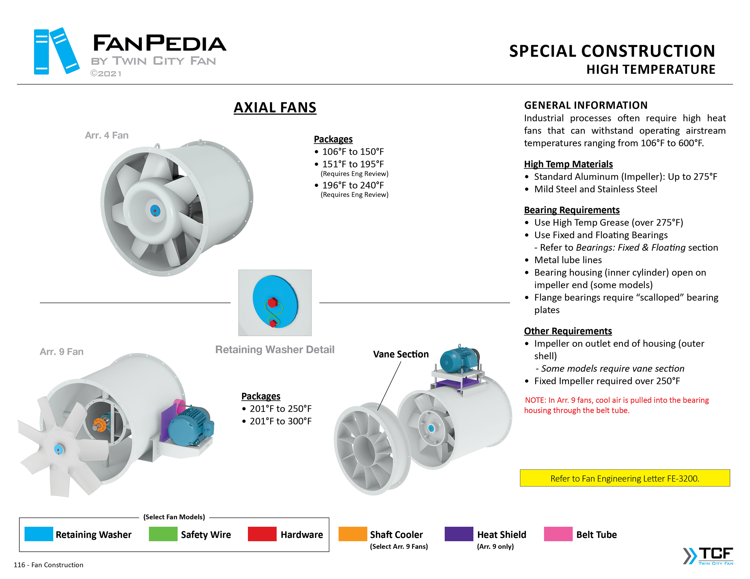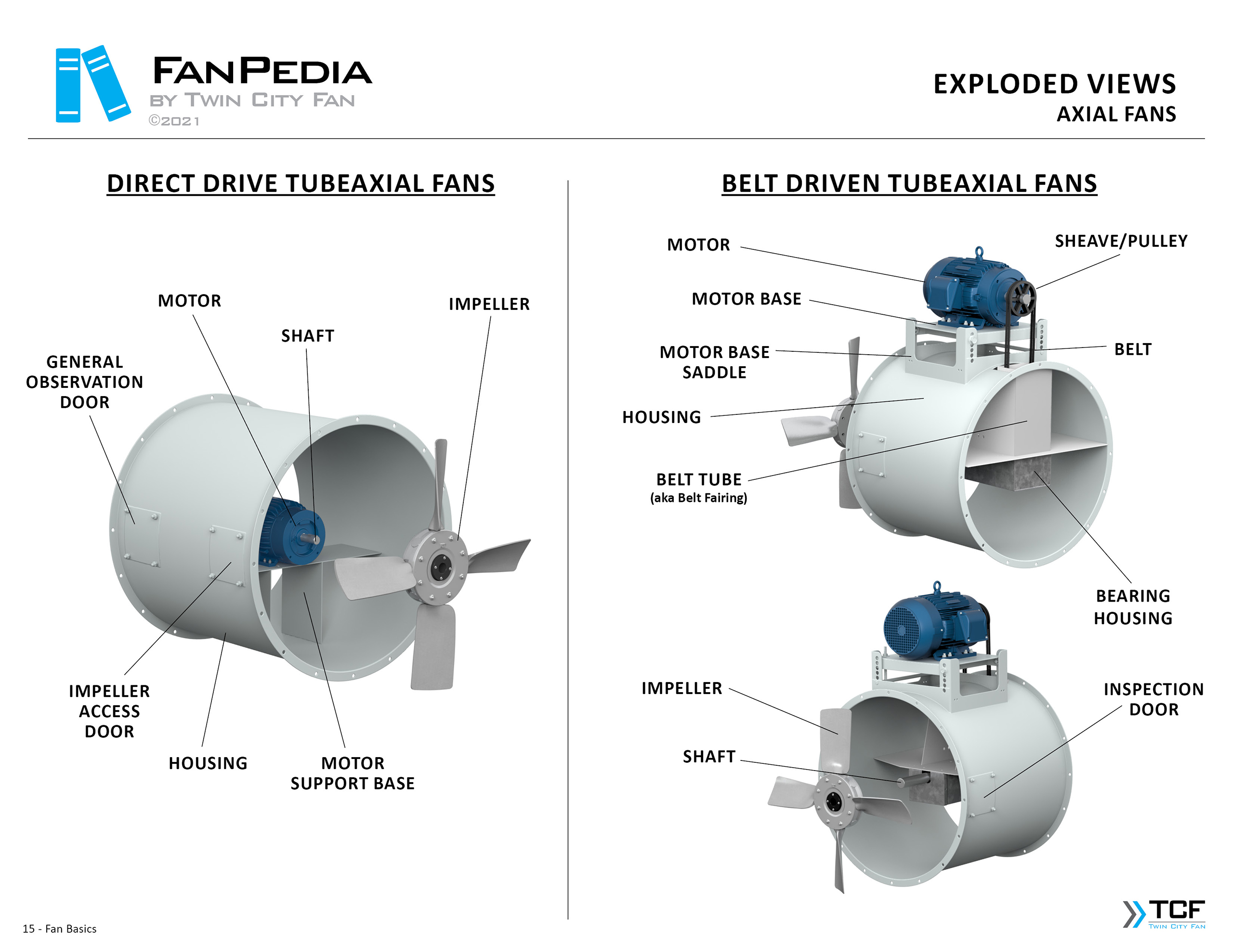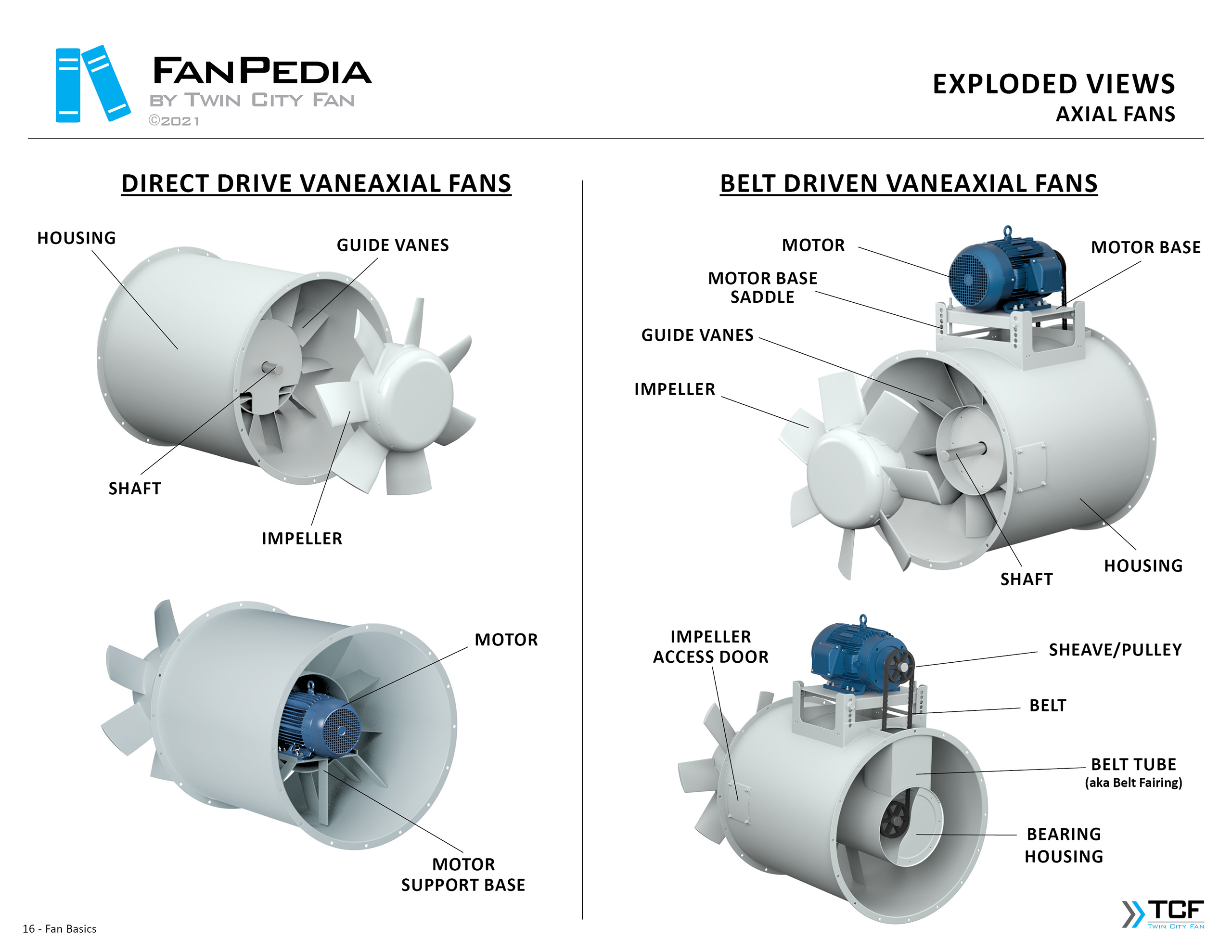 Vaneaxial fans are designed for applications where large volumes of air are required at moderate to high pressures. Direct and belt driven models, with fixed and adjustable blade impellers, are available. The tubular design and high impeller efficiency provides maximum performance while using minimal space.
