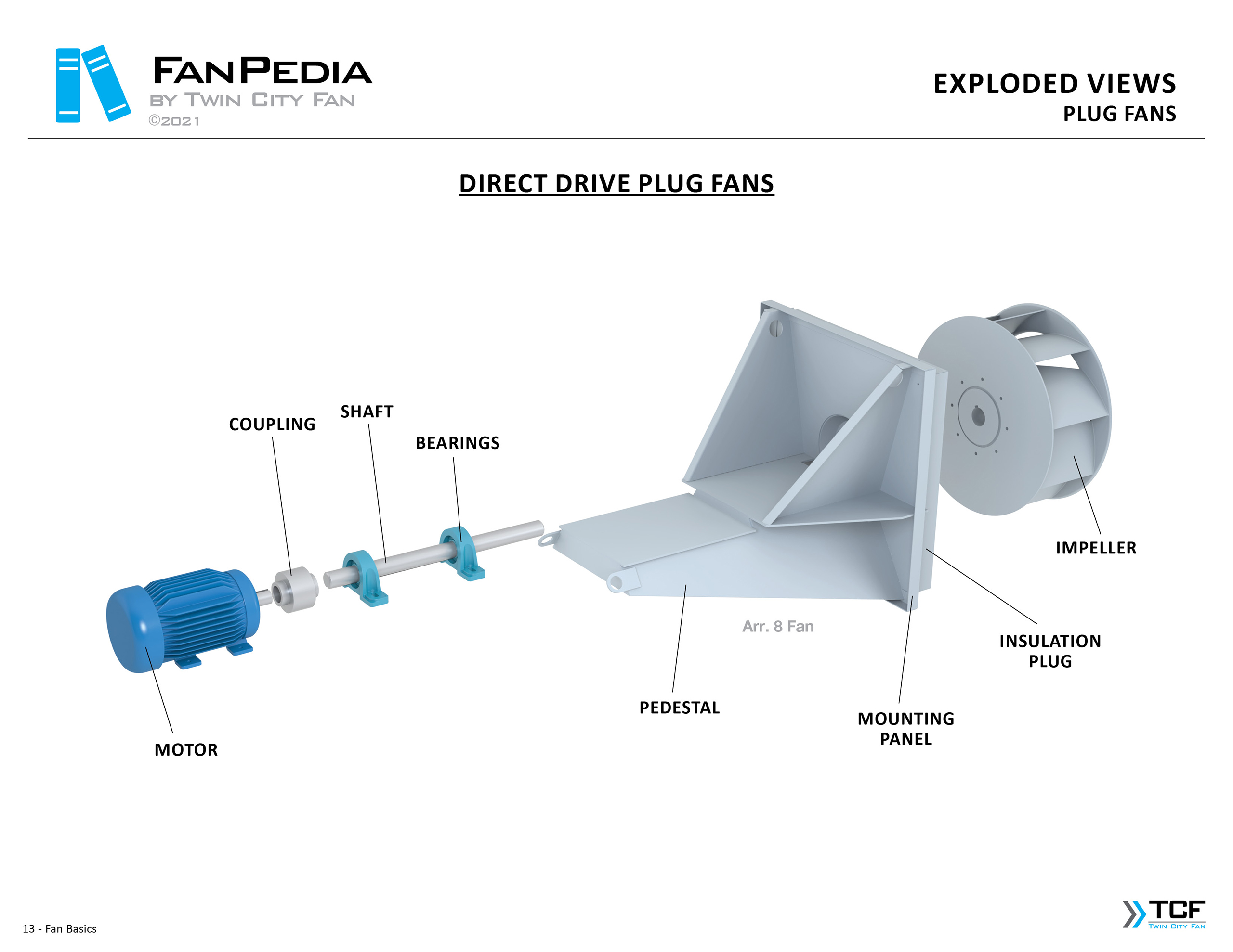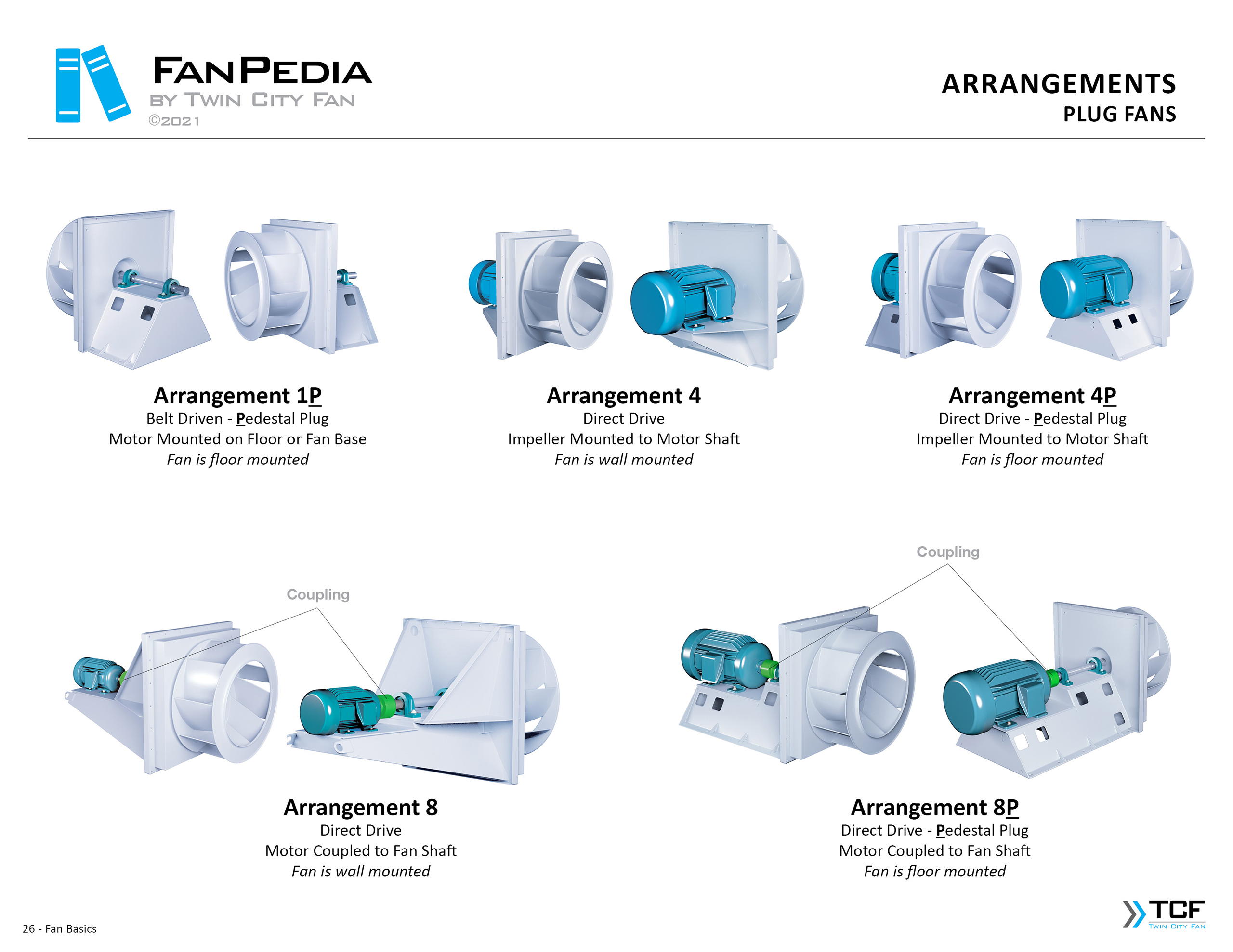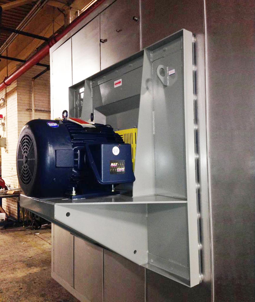 Plug fans offer great versatility for complex system configurations. Equipped with a gusseted mounting panel, they are mounted directly to the plenum wall separating the motor and drive components from the process air. Plug fans provide high efficiency recirculation air with the benefit of easy installation and removal.
