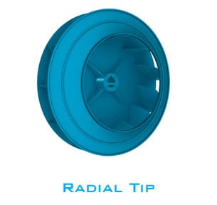 Radial tip and high efficiency fans offer great efficiencies for a wide range of applications requiring high airflow and moderate pressures. The non-overloading design can handle high temperatures, corrosive airstreams and light particulate where the radial tip designs are better suited for dirty, particulate-laden air. With high airflows the radial tip fan is much more efficient than the comparable radial blade fan.